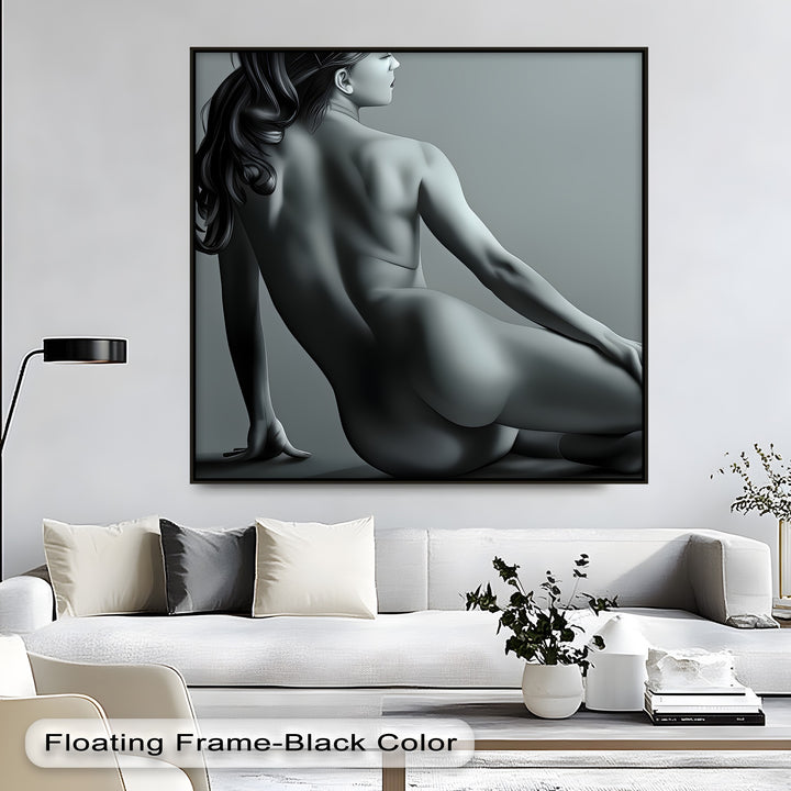 Bathed in soft monochrome light, Silver Serenity celebrates the timeless elegance of the female form. This graceful erotic canvas print captures a woman seated in quiet reflection, her posture relaxed, her curves accentuated by delicate shadows that dance across her back and thighs.