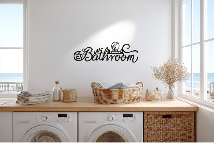 Bring sophistication and creativity to your home with the Stylish Script Bathroom – Modern Metal Wall Art Sign. This elegant design features the word “Bathroom” in flowing cursive typography, beautifully combined with minimalist icons such as a sink, mirror, and soap dispenser. It’s the perfect wall accent for adding modern charm to your bathroom space.