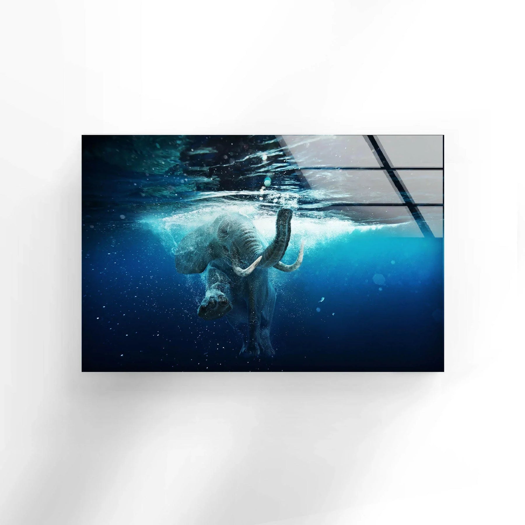Transform your space with the captivating Swimming Elephant animal art. This stunning Glass Wall Art features an elephant submerged in tranquil blue water, offering a surreal and majestic touch that adds depth and wonder to your decor. Ideal for creating a peaceful and imaginative atmosphere, this piece captivates and inspires.