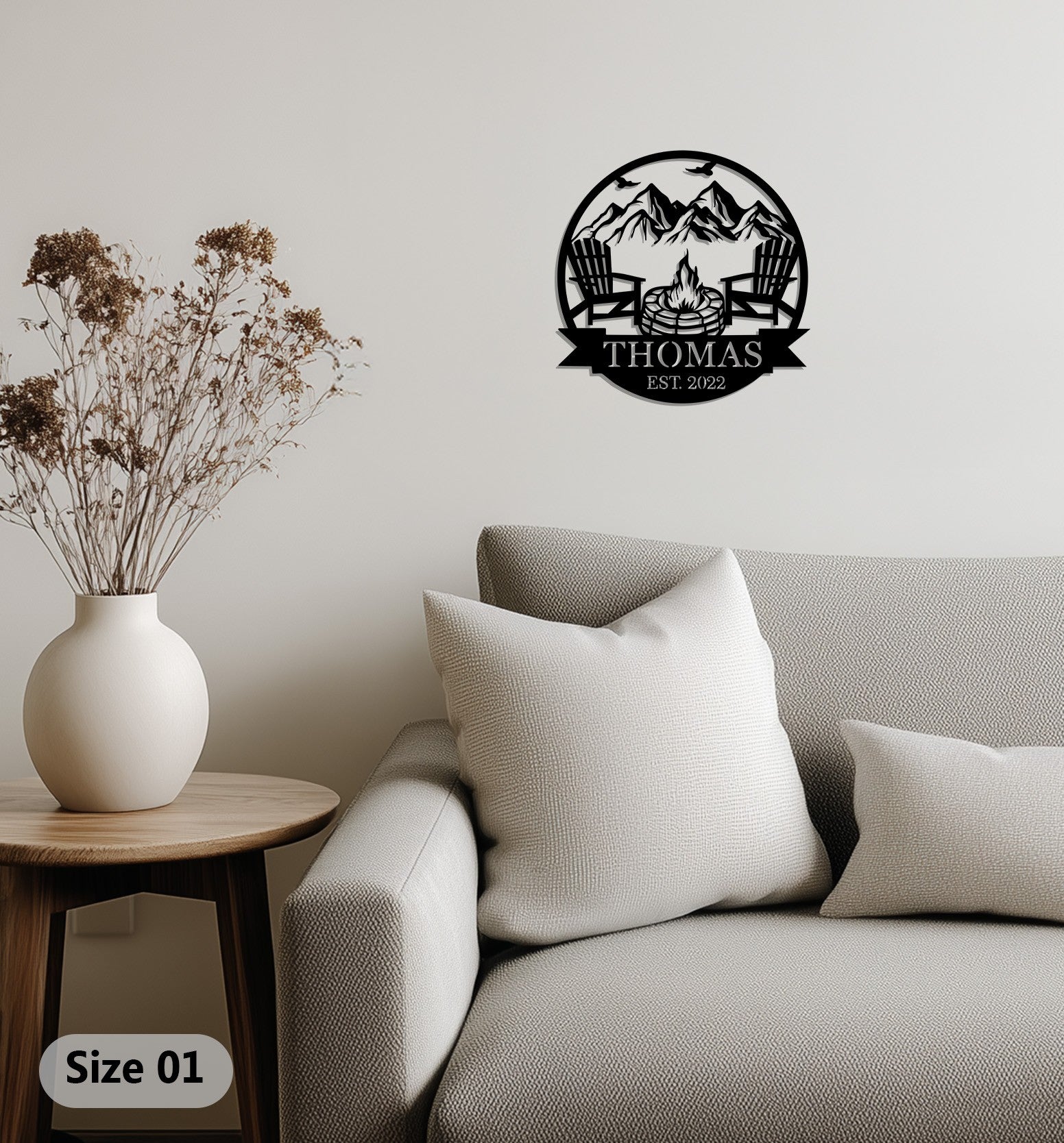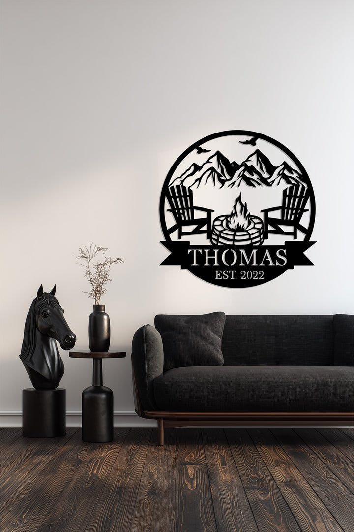 Create a cozy and welcoming outdoor vibe with the Thomas Firepit Metal Wall Art – Personalized Outdoor Family Name Sign. Featuring two chairs around a warm firepit framed by majestic mountain peaks and flying birds, this design beautifully captures the spirit of relaxation, family time, and nature’s tranquility.