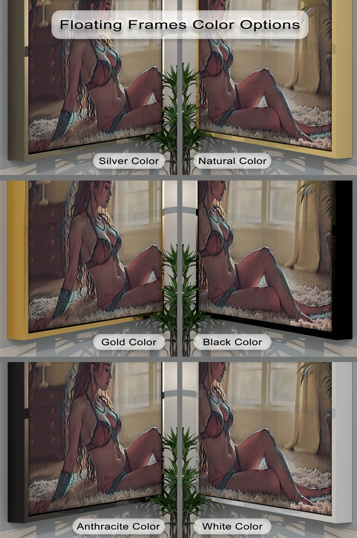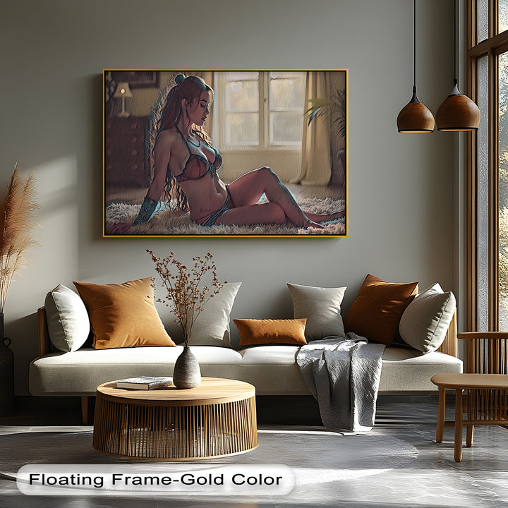 Ideal for romantic bedrooms, luxury lounges, or modern gallery walls, this framed canvas wall art makes a subtle yet unforgettable statement. The tactile softness of the rug, the warm-toned palette, and the introspective pose together create an atmosphere of intimate elegance.