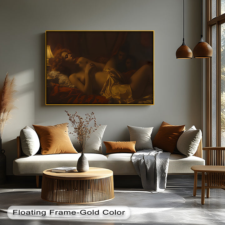 Sink into the dimly lit allure of Velvet Secrets, a dark moody erotic canvas wall art that captures intimacy and shadow with cinematic flair. Draped in golden silk and surrounded by glowing lamp light, the reclining figure evokes mystery, passion, and voyeuristic elegance. The masked figures in the backdrop add surreal tension—blurring the line between fantasy and fear.