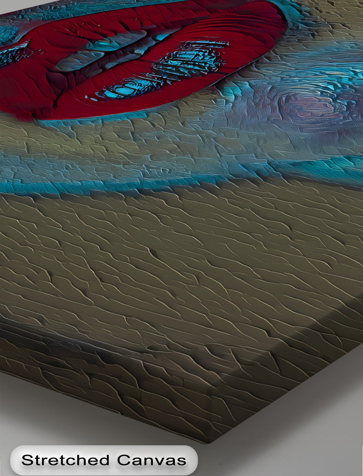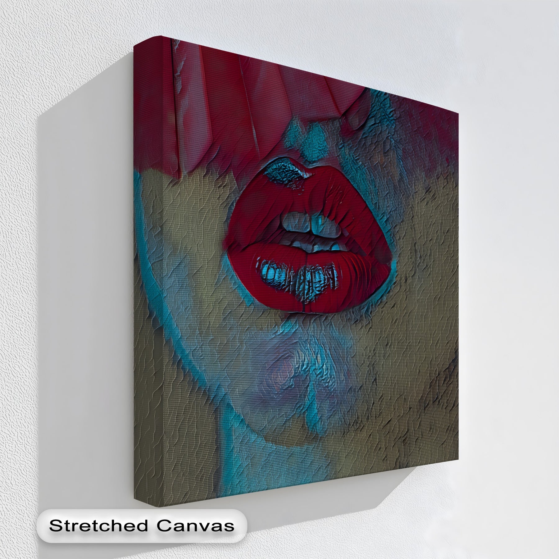 A whisper never spoken, a desire never named. Velvet Silence is a striking erotic canvas print that captures a provocative close-up of deep red lips, slightly parted in mystery and temptation. The textured palette of electric blues and shadows evokes the intimacy of silence, where sensuality speaks louder than words.