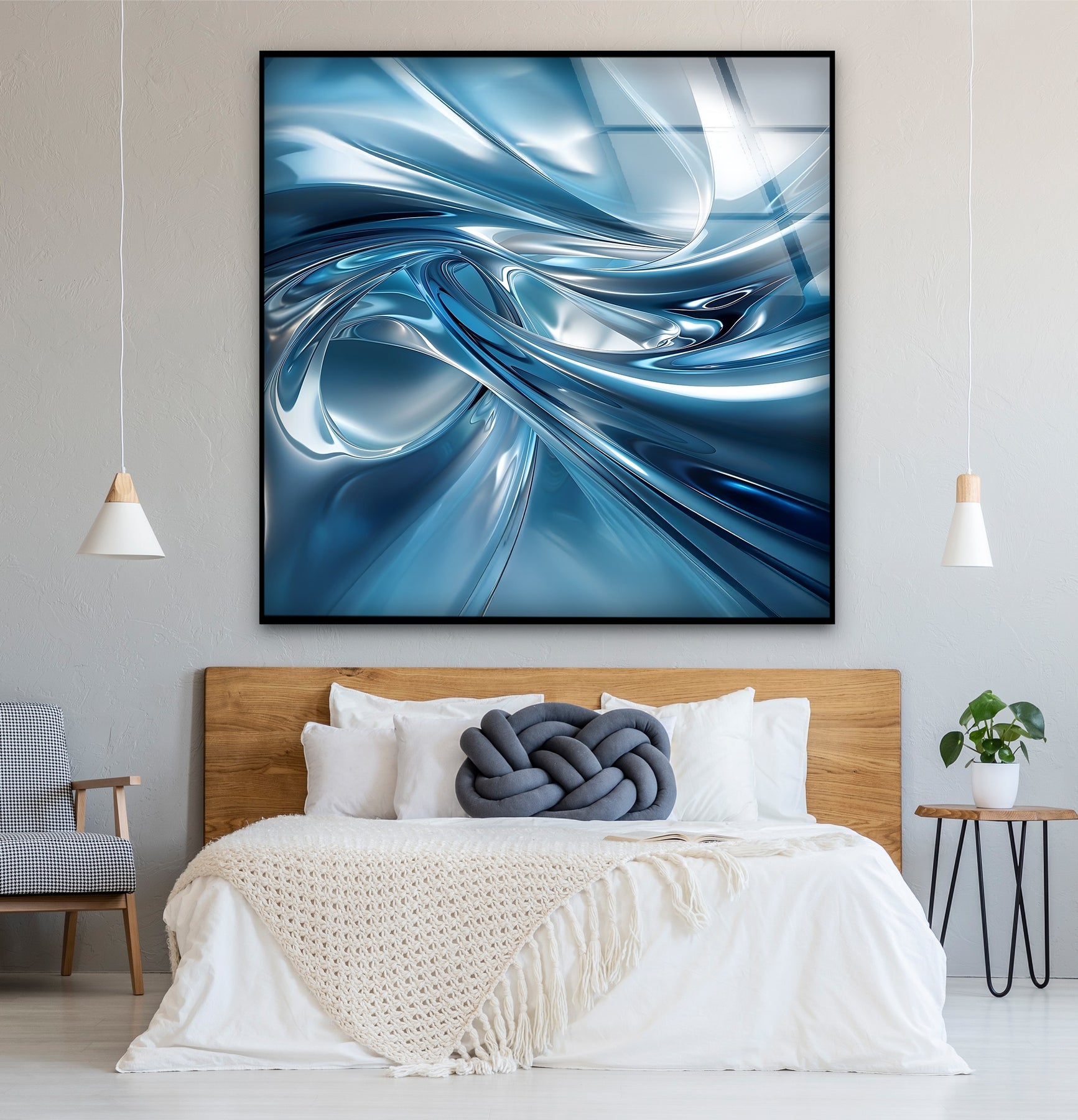 Immerse your space in a wave of futuristic elegance with Azure Liquid Motion – Abstract Chrome Blue Glass Wall Art. Featuring fluid metallic forms in deep sapphire and icy silver tones, this artwork captures the hypnotic movement of liquid metal in motion. The swirling chrome-blue ribbons create depth, energy, and a modern sculptural effect—perfect for interiors that demand a bold, high-end statement.
