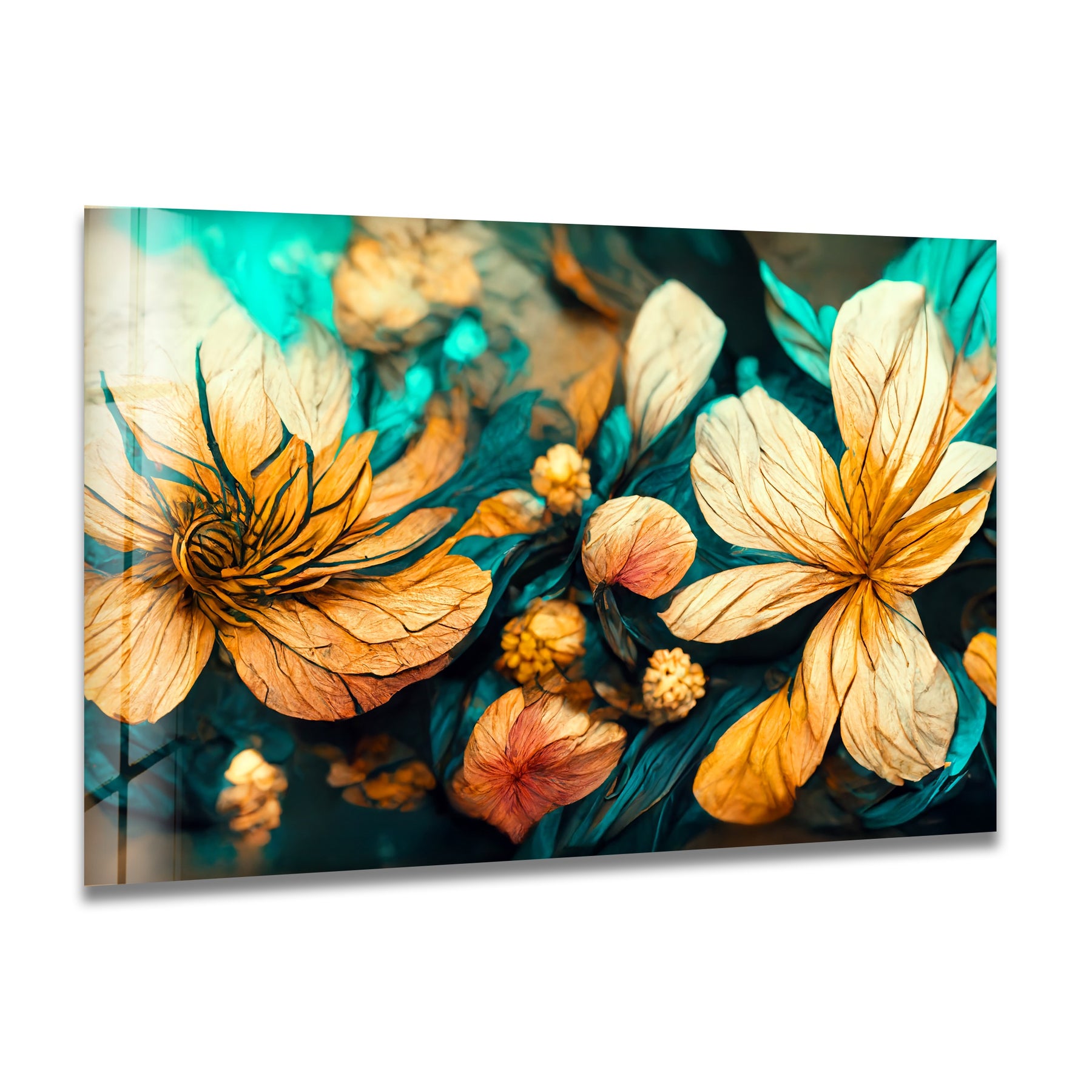 Bring warmth, vibrancy, and artistic charm into your space with Golden Petal Bloom – Artistic Floral Fantasy Glass Wall Art. This stunning design features oversized golden blossoms paired with rich teal leaves, creating a dreamlike botanical composition that feels both modern and enchanting. The hand-drawn textures and painterly gradients add an elegant, high-end aesthetic—perfect for interiors that embrace nature-inspired sophistication.