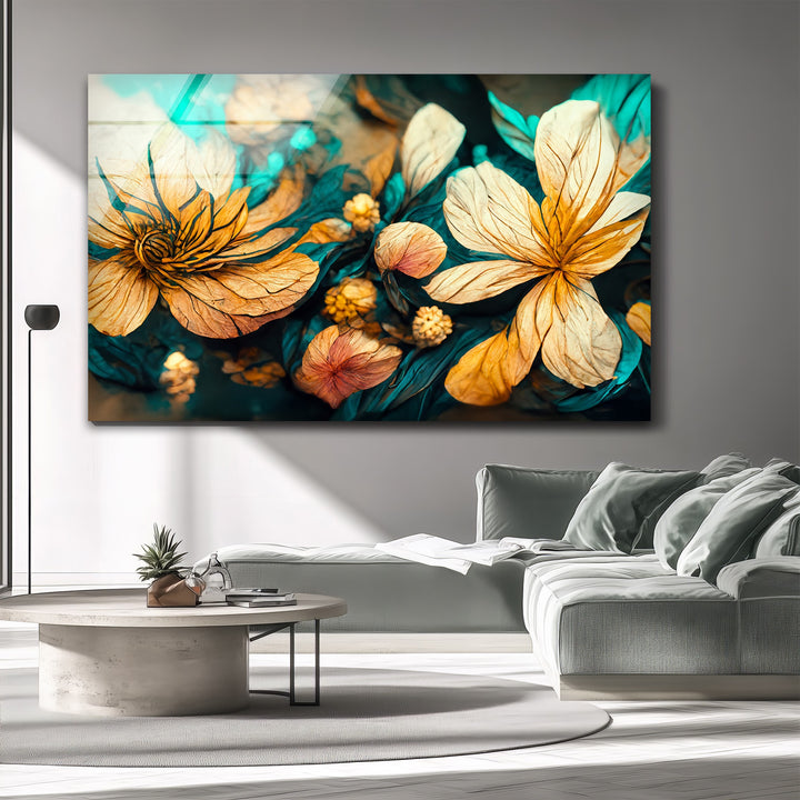 Golden Petal Bloom – Artistic Floral Fantasy Glass Wall Art
