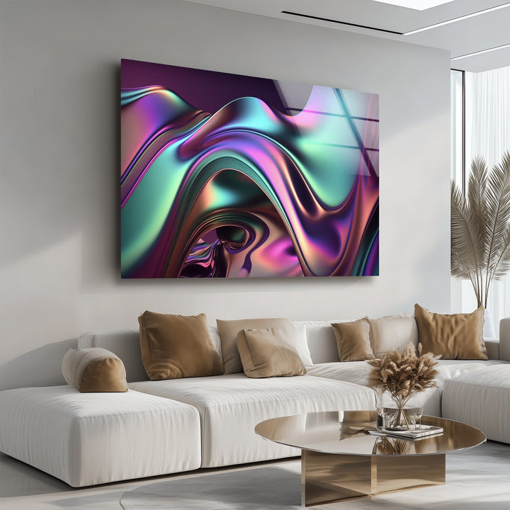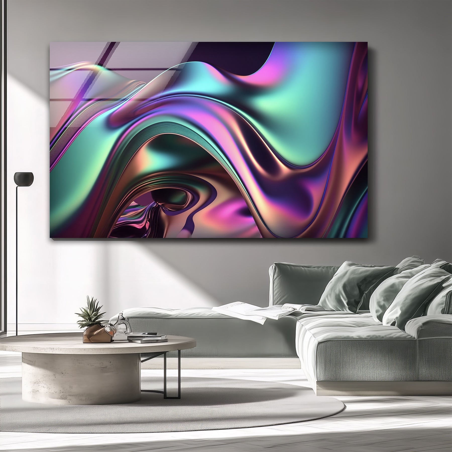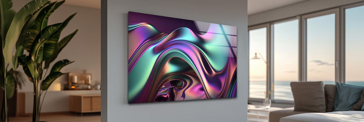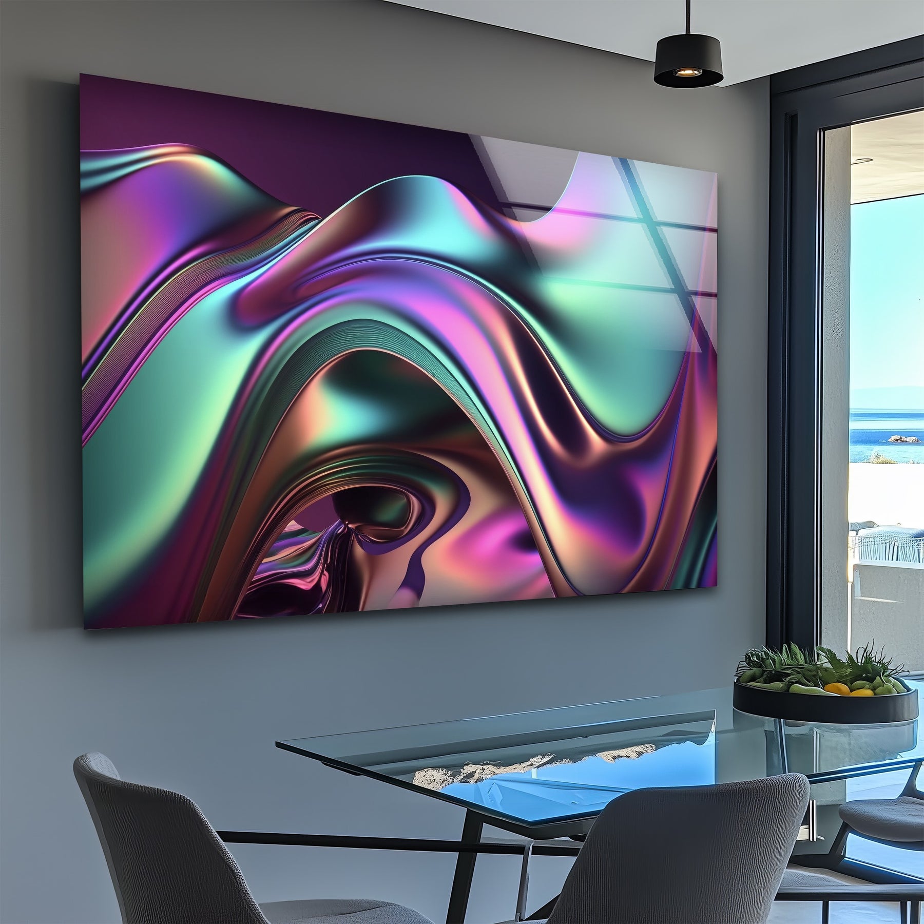 Transform your space into a vibrant, futuristic gallery with Iridescent Wave Mirage – Neon Chrome Flow Glass Wall Art. This mesmerizing artwork features flowing metallic curves in shifting hues of emerald, pink, violet, and turquoise—creating a surreal, color-shifting chrome effect that changes with the light. The smooth wave-like forms feel fluid, energetic, and hypnotically modern, making this piece perfect for bold contemporary interiors.