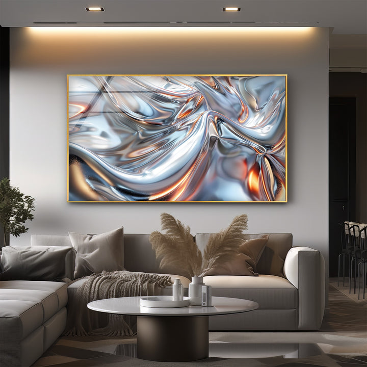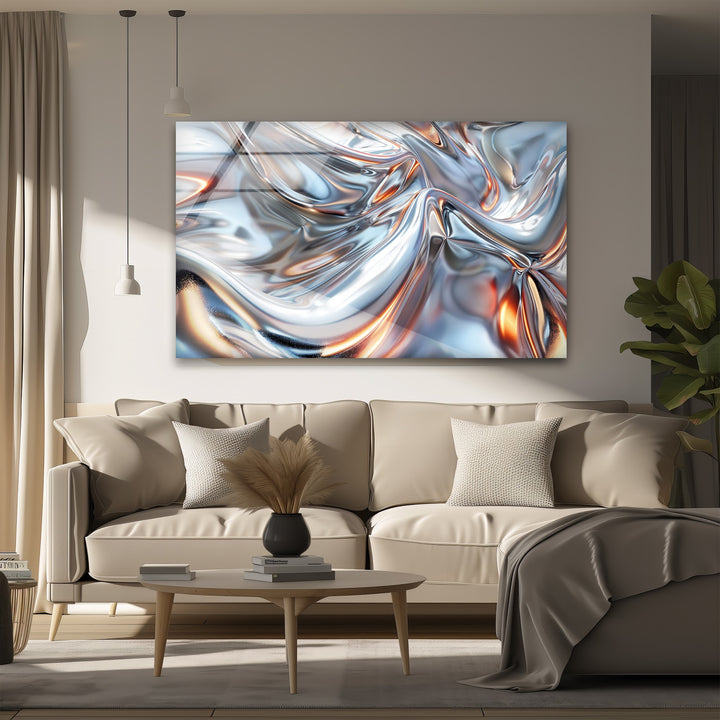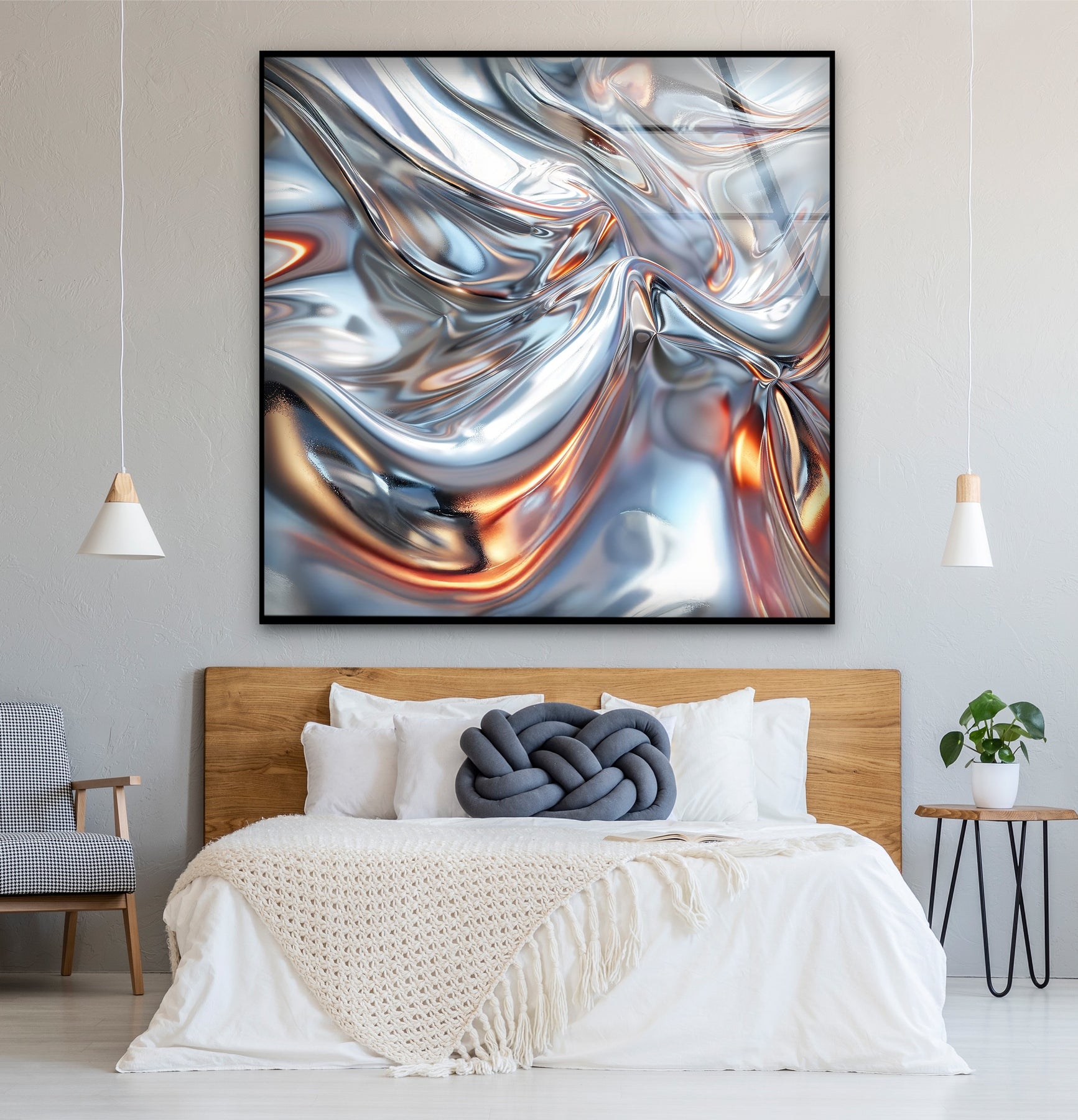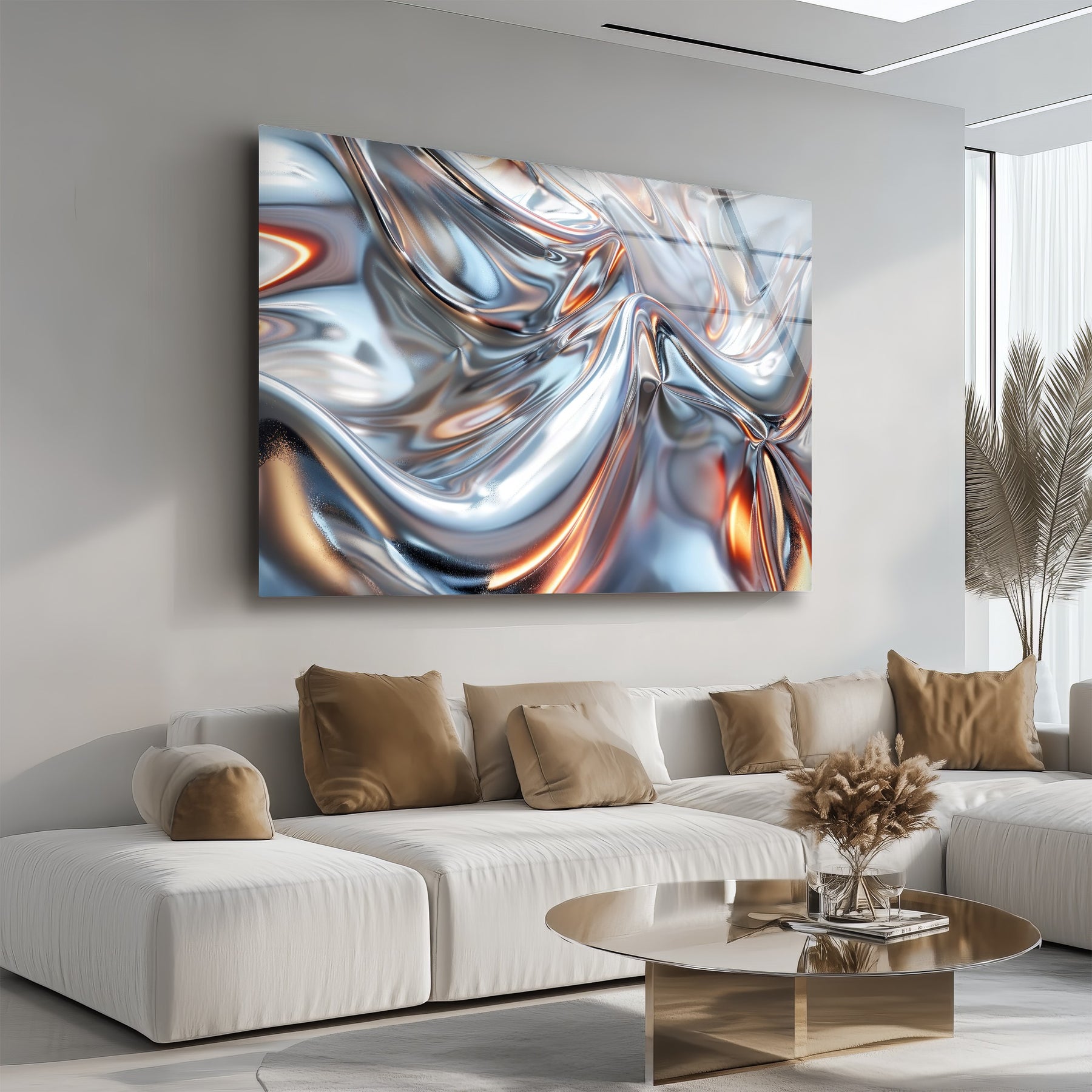 Transform your interior with the polished elegance of Luminous Steel Drift – Abstract Chrome Silver Glass Wall Art. This striking design features smooth liquid-metal forms in radiant silver tones, illuminated by soft copper and amber highlights. The flowing chrome texture creates a dynamic sense of movement and depth, giving your space a luxurious, futuristic aesthetic.