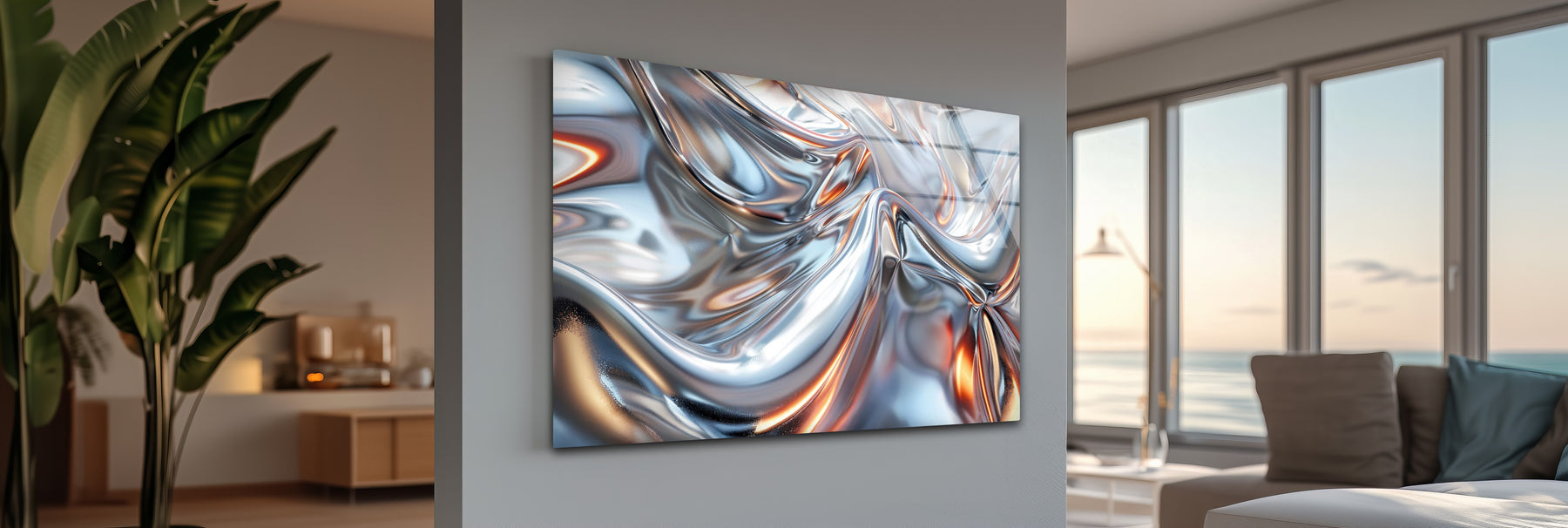 Printed on ultra-gloss premium glass, every reflection, ripple, and metallic contour is captured with crystal clarity. Perfect for modern living rooms, office environments, bedrooms, or upscale commercial spaces, this artwork becomes a captivating focal point—sleek, contemporary, and visually powerful.