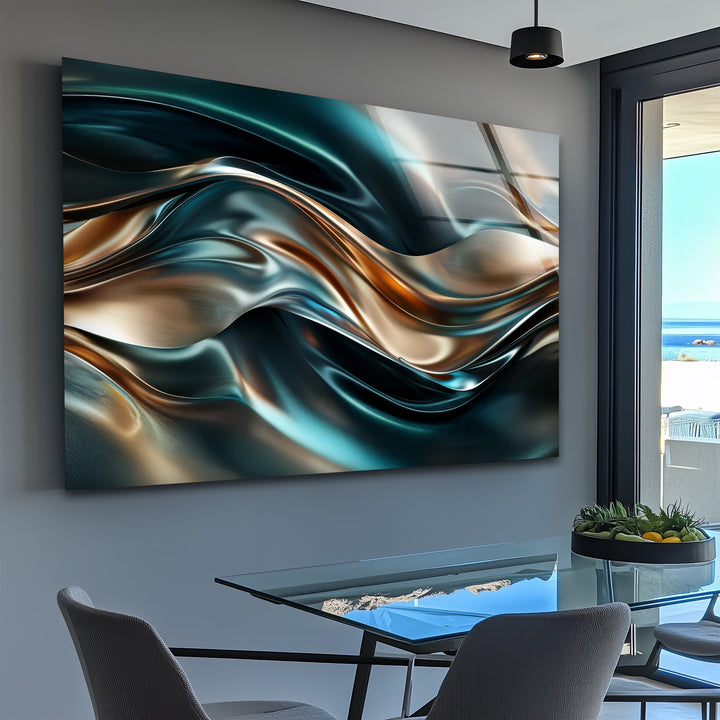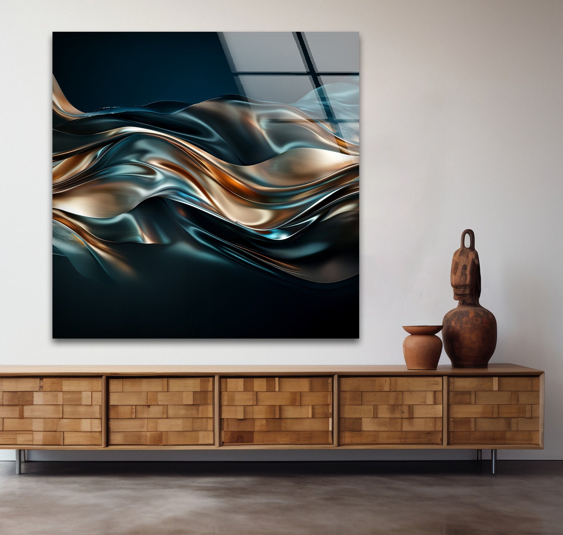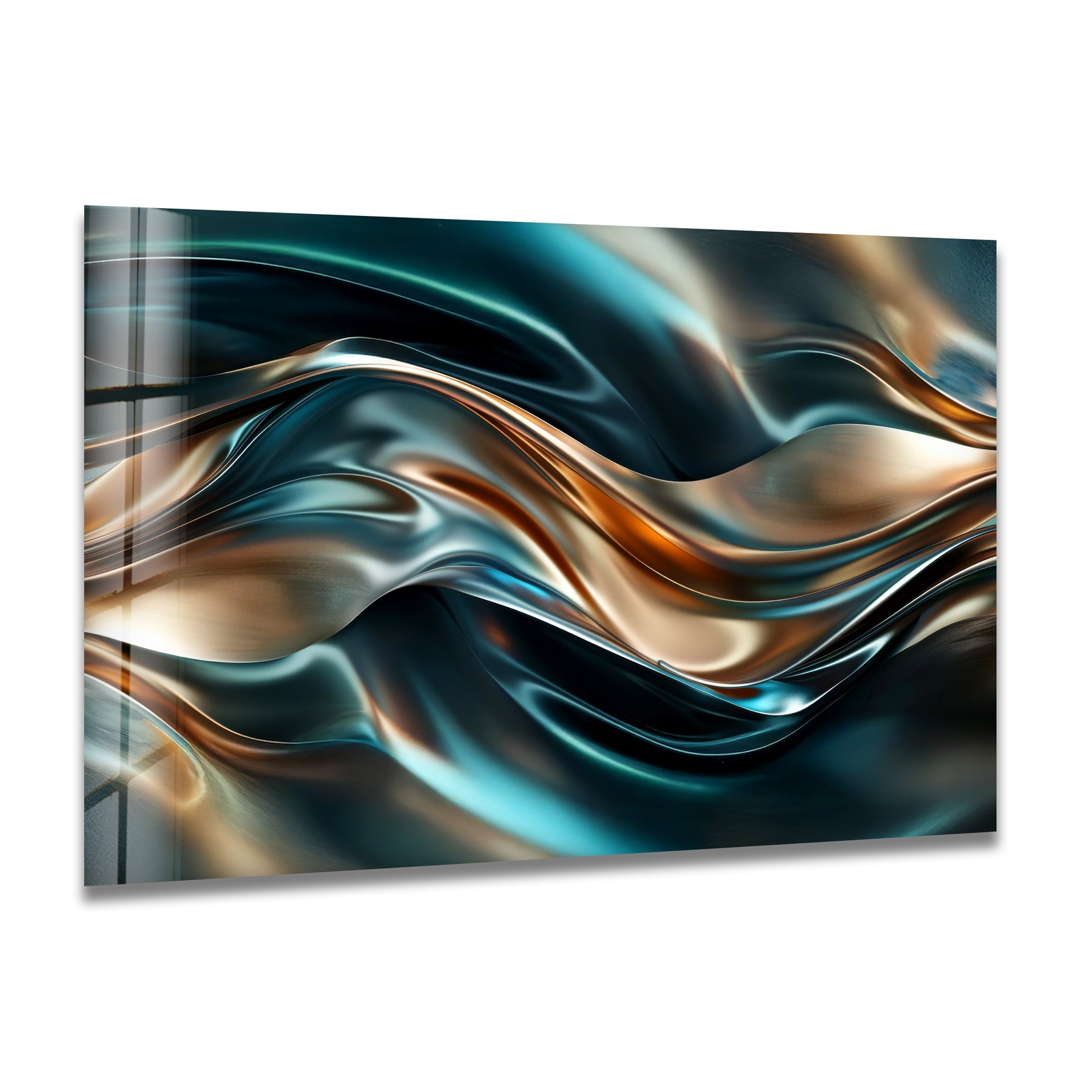 Introduce a luxurious sense of motion and depth into your interior with Ocean Bronze Serpentine – Abstract Metallic Wave Glass Wall Art. This stunning artwork blends deep ocean blues with polished bronze and silver reflections, creating a fluid wave effect that feels both serene and powerful. The glossy metallic curves ripple across the surface like molten water—perfect for modern, coastal-inspired, or high-end contemporary décor.