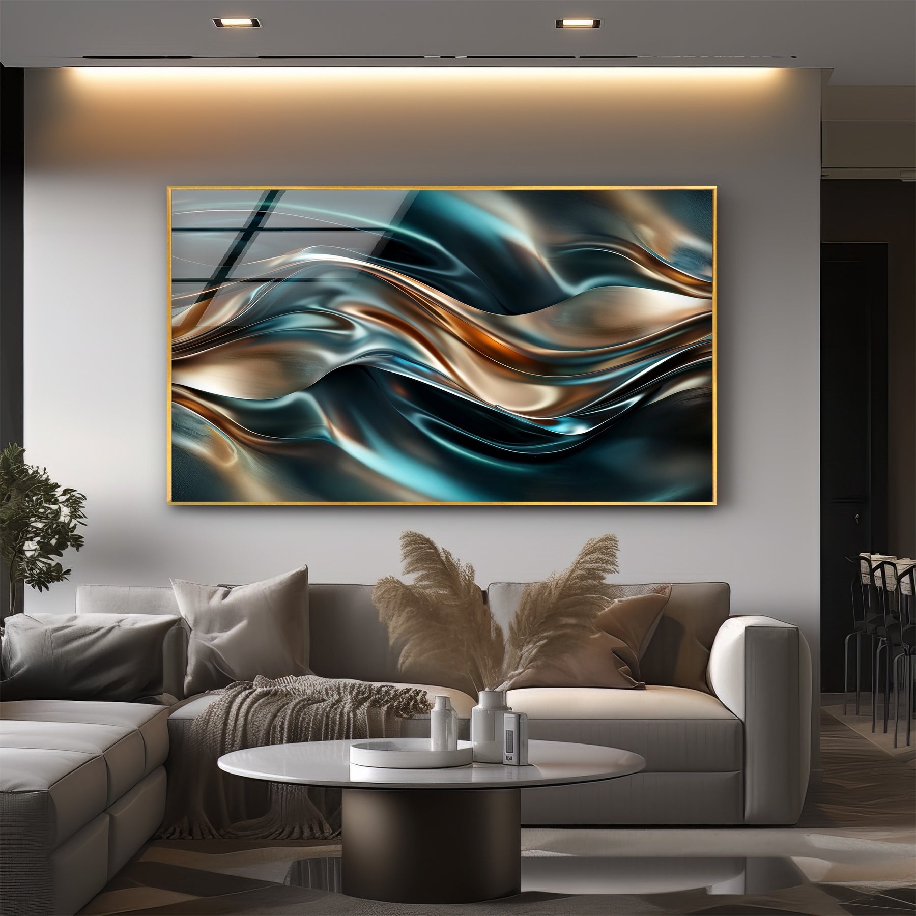 Printed on premium high-gloss glass, every highlight, reflection, and metallic texture appears crisp and radiant. Ideal for living rooms, offices, bedrooms, or stylish commercial environments, this piece transforms any wall into a sophisticated focal point with its sleek, immersive visual flow.