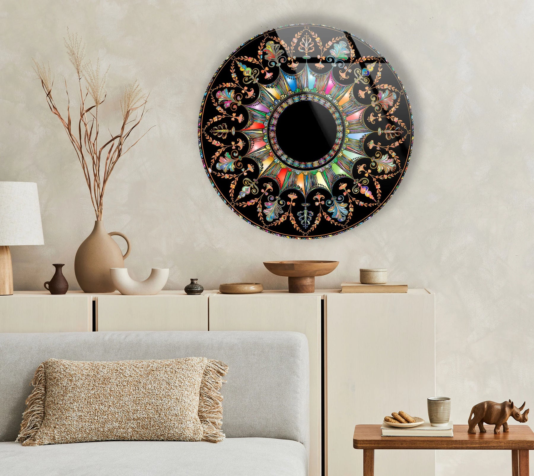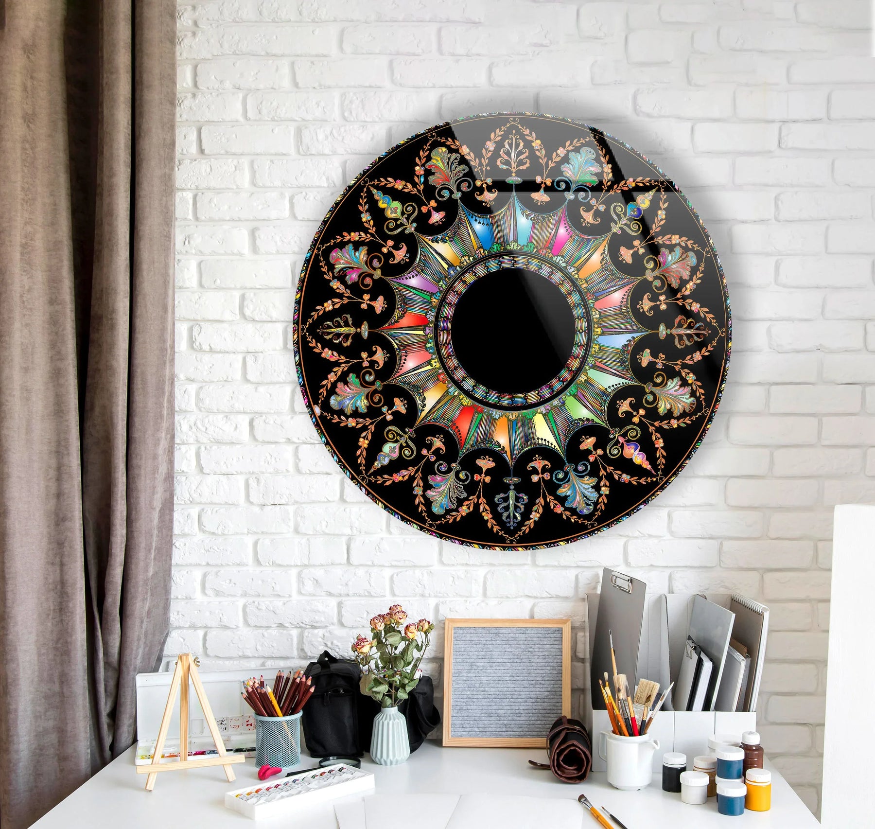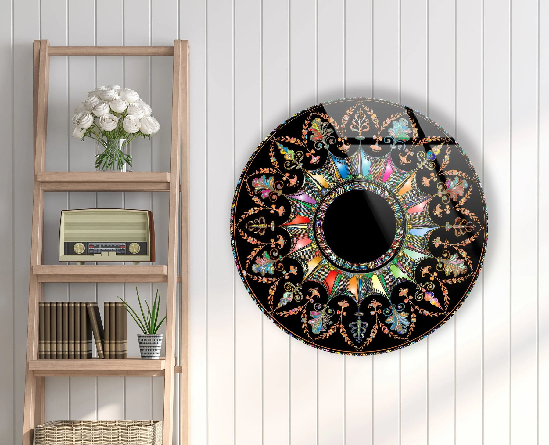 Mandala Round Wall Art – Ornate Colorful Glass Print with Black Background for Luxe Boho or Modern Decor - MyPhotoStation