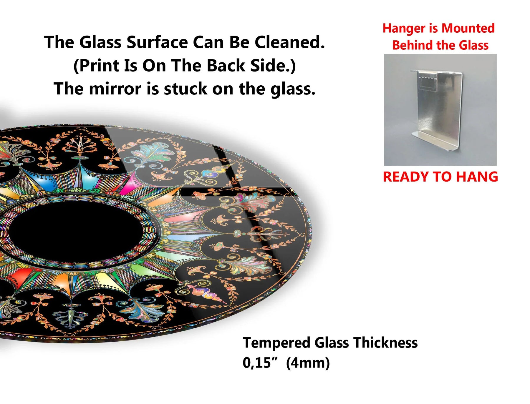 Make a dramatic and elegant statement with this Mandala Round Wall Art, designed with radiant color bursts against a bold black background. Inspired by sacred geometry and traditional mandala motifs, this symmetrical glass piece blends ornate floral elements with vibrant jewel tones and gold-accented detailing. Whether you place it in a chic living room, stylish hallway, or meditation space, it adds a sense of luxury, balance, and global flair. UV printed on tempered glass, this artwork delivers superior color brilliance, a glossy finish, and durable quality that captures attention instantly.