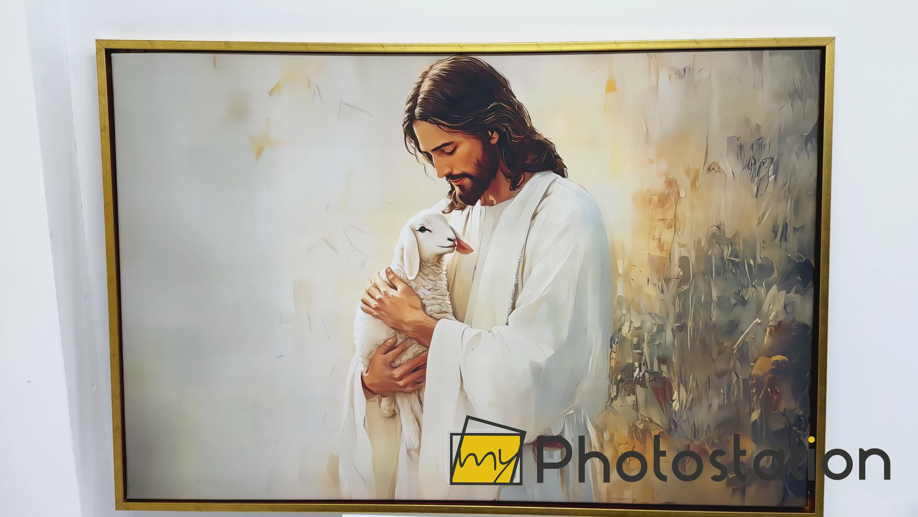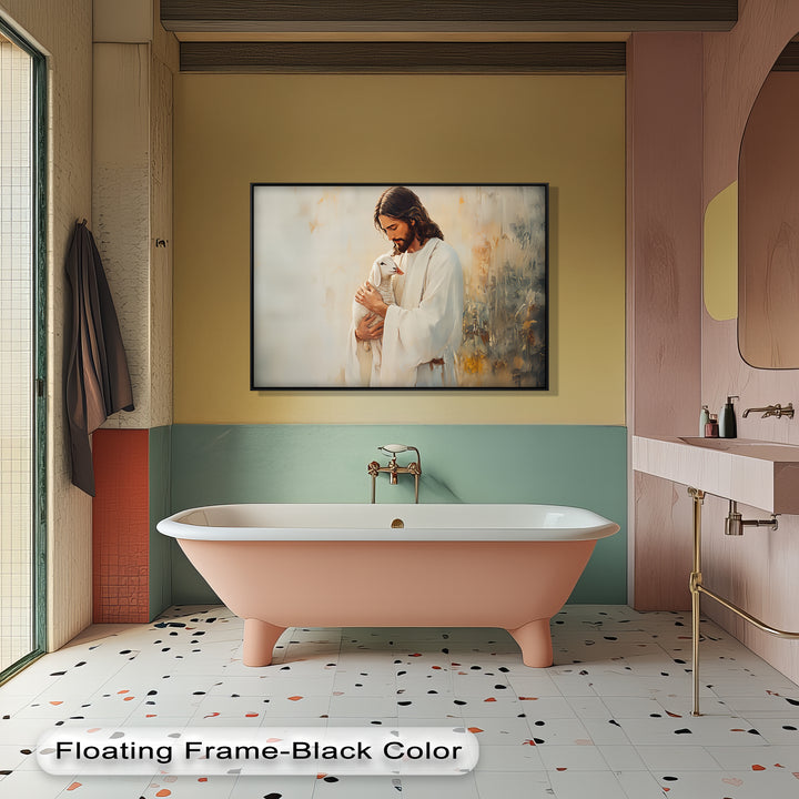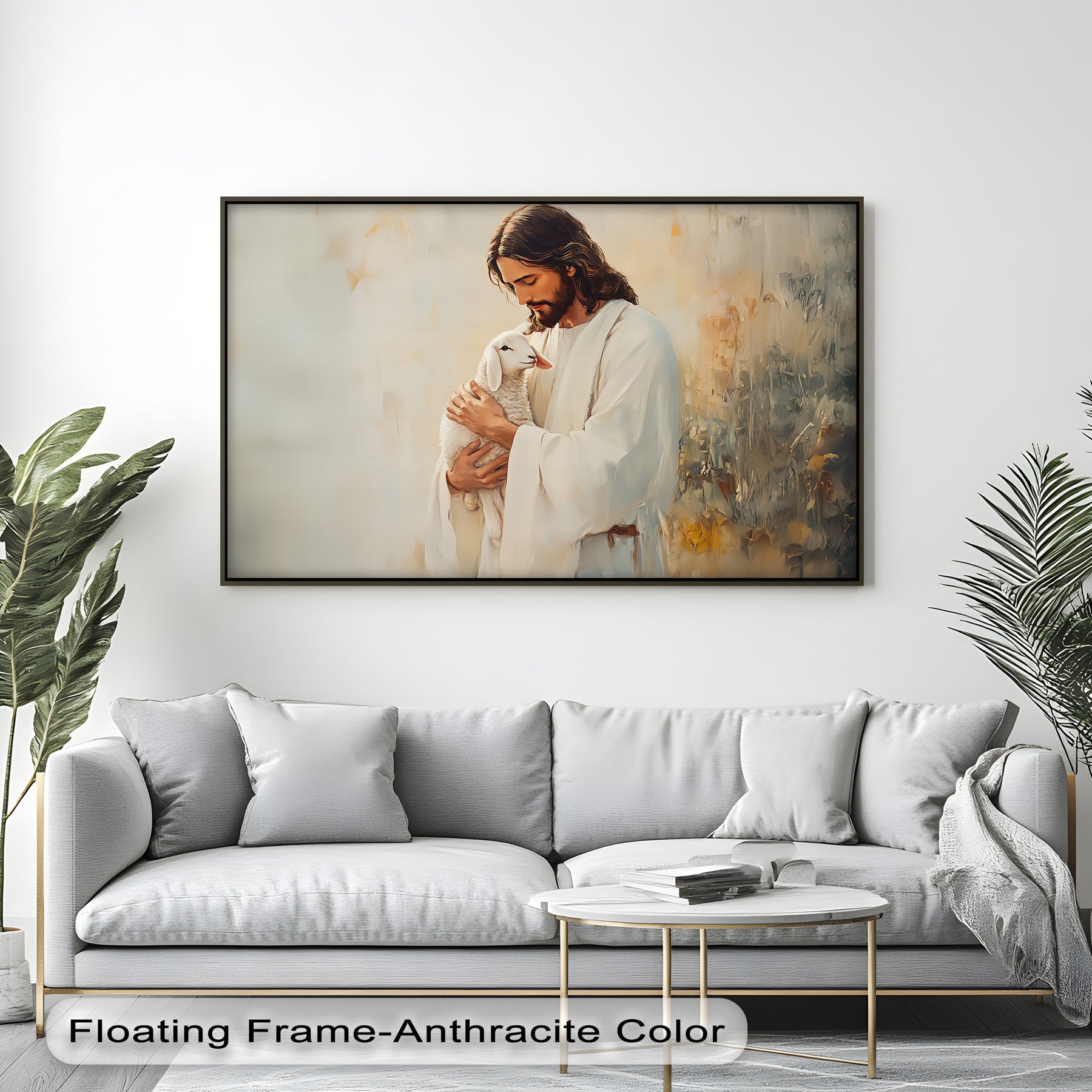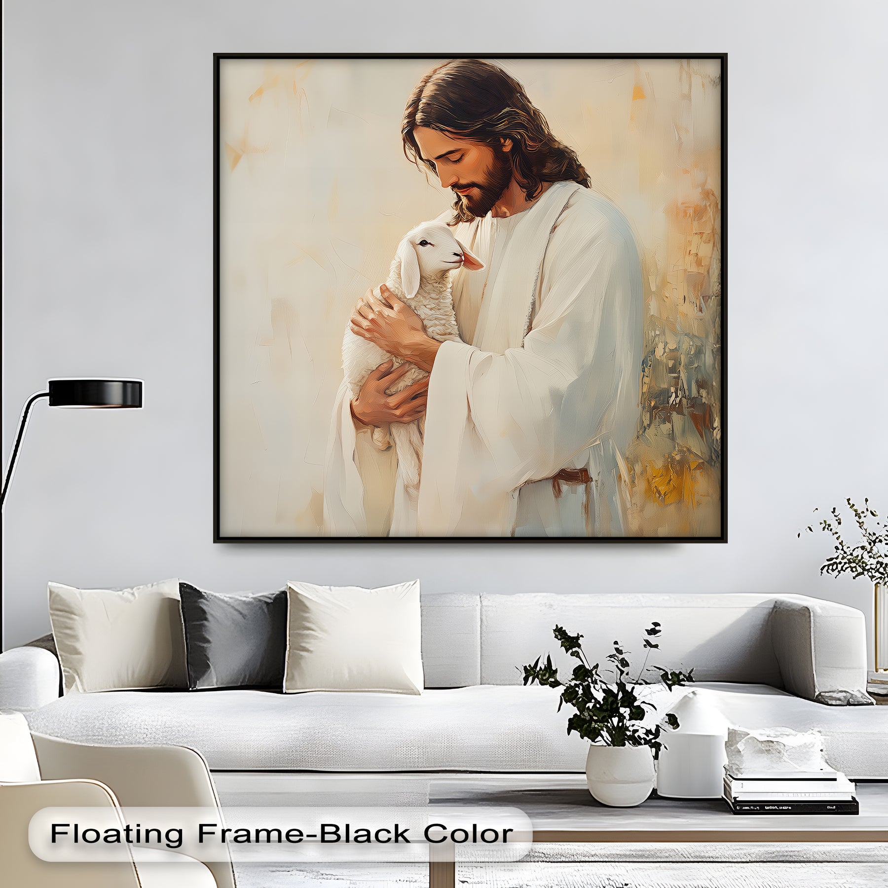 A tender portrayal of divine compassion, this canvas print captures Jesus cradling a lamb in a moment of serene affection. His gentle gaze and soft embrace embody the essence of the Good Shepherd—protector, guide, and loving caretaker of His flock. With its soft, warm tones and expressive brushwork, this artwork brings spiritual comfort to any space, making it ideal for prayer rooms, living areas, or sacred corners at home.