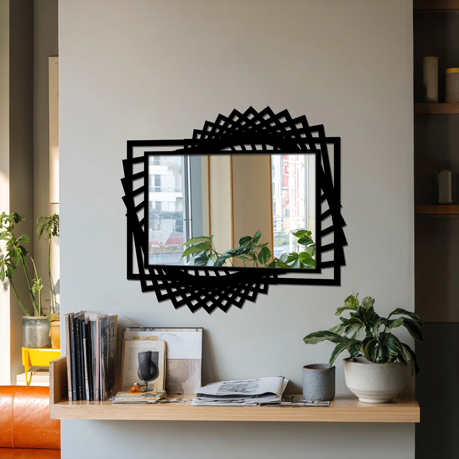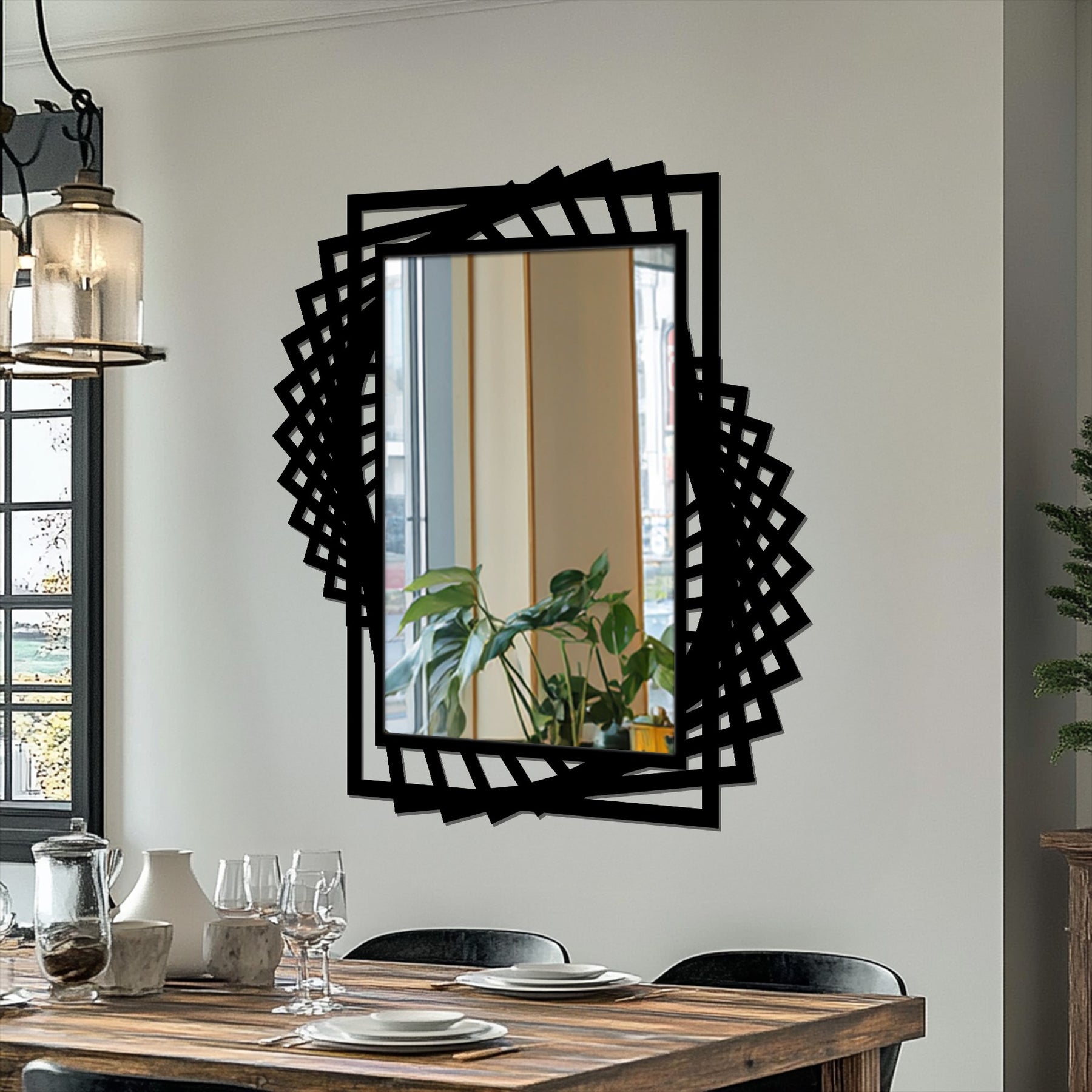 Este Marco de metal con giro dinámico Espejo De Pie Transforma la geometría estricta en movimiento. Un espejo rectangular limpio se sitúa en el centro, mientras que los marcos metálicos en capas giran hacia afuera en una composición rítmica, casi cinética. Los ángulos escalonados crean una sensación de movimiento, profundidad y caos controlado, perfecto para interiores que buscan una sensación audaz, artística y contemporánea.
