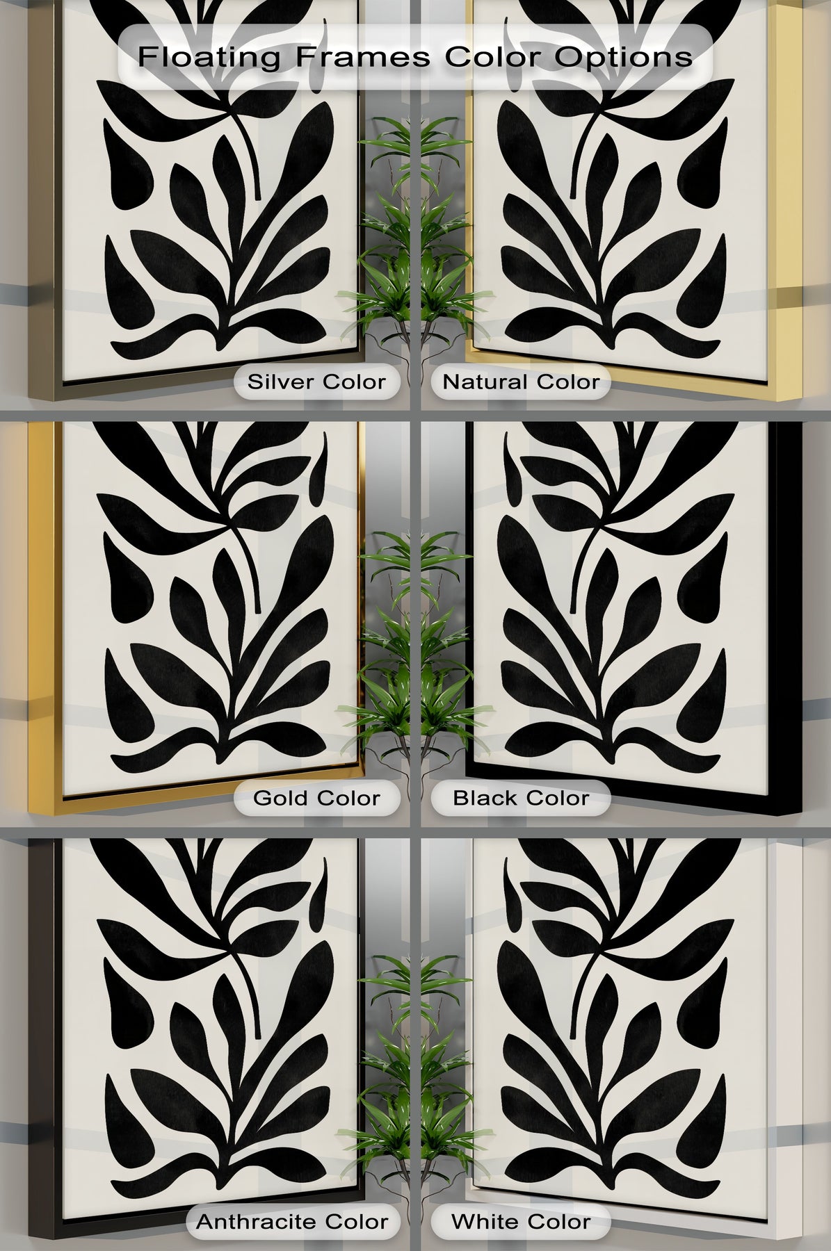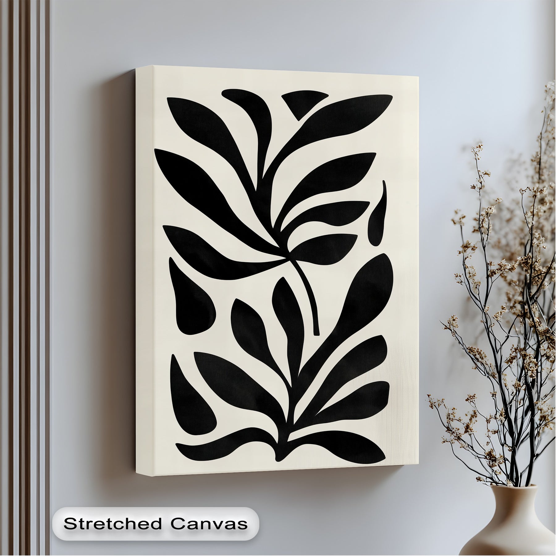 The brightest area highlights the minimalist black botanical canvas wall art, showcasing the abstract leaf design in a variety of frame color options.