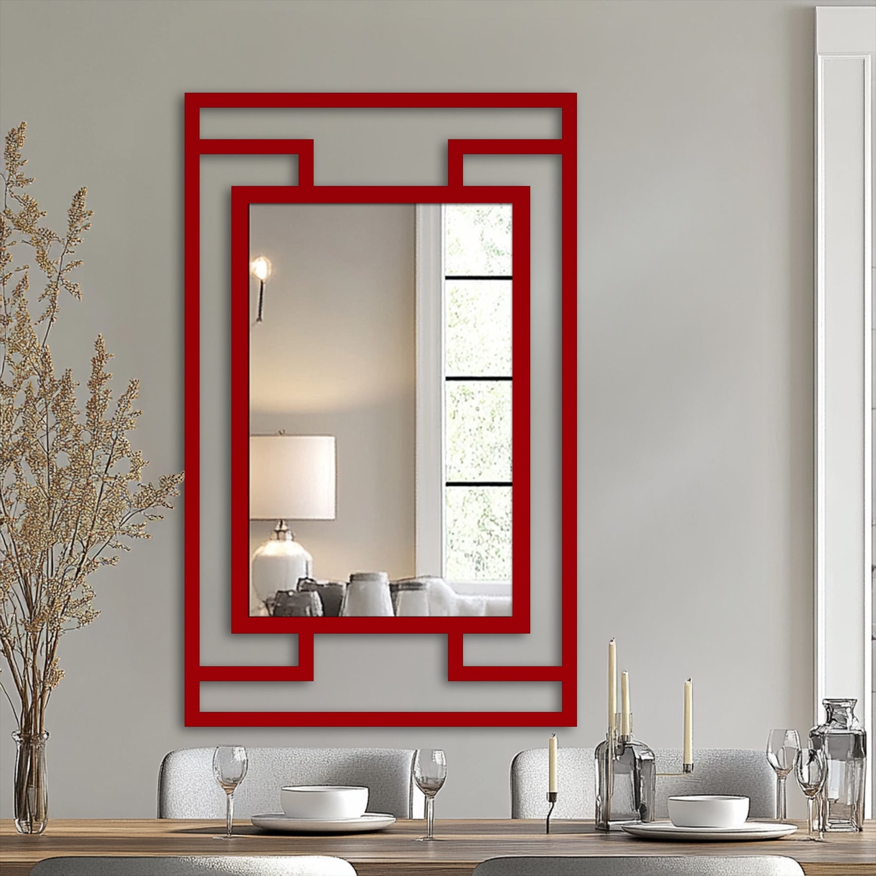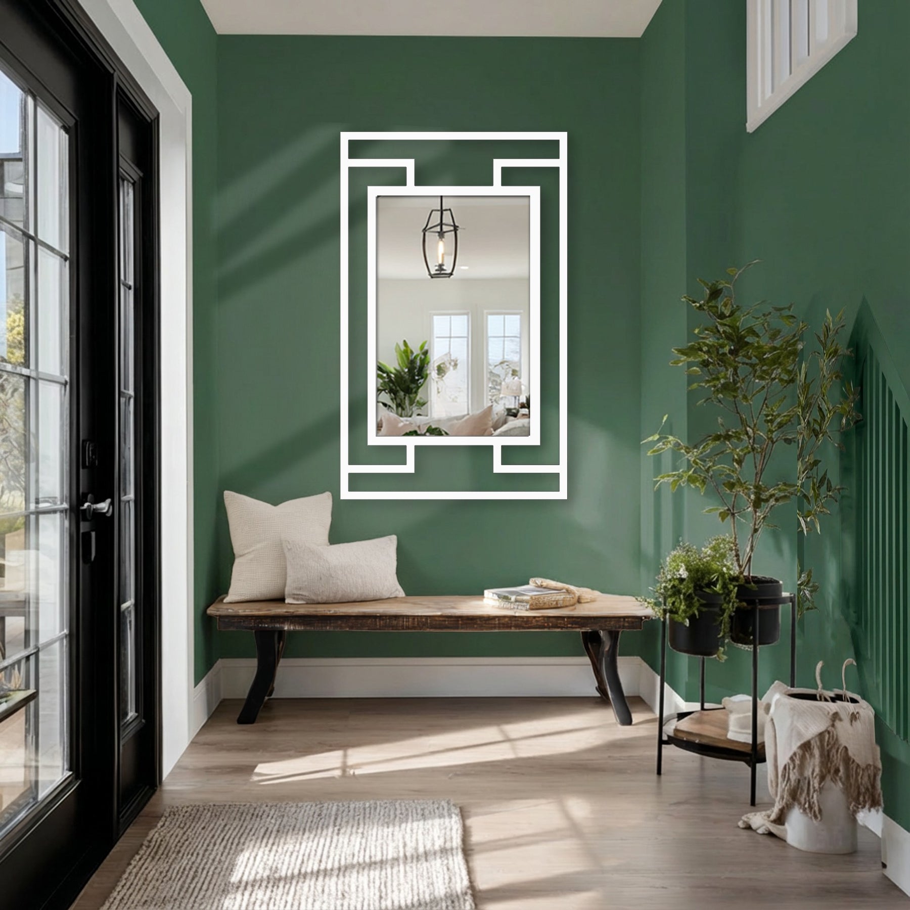 Este geometría de marco escalonado Decoración De Pared Metal espejo Es una expresión refinada del diseño arquitectónico moderno. Con un llamativo espejo rectangular enmarcado por líneas metálicas negras escalonadas, la composición crea una fuerte sensación de profundidad, orden y fluidez visual.