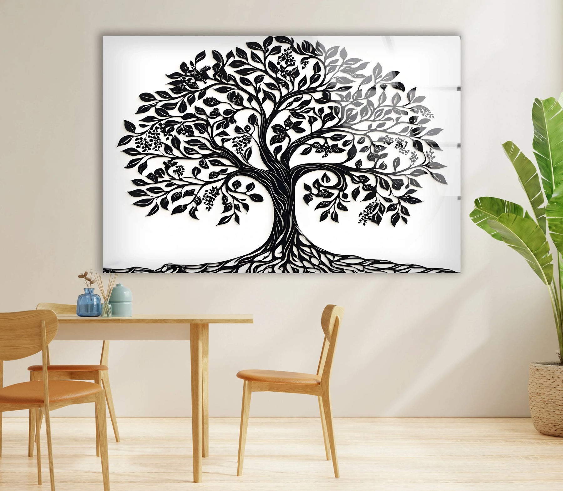 Black and white glass wall art featuring a detailed decorative tree with intricate branches, leaves, and roots.