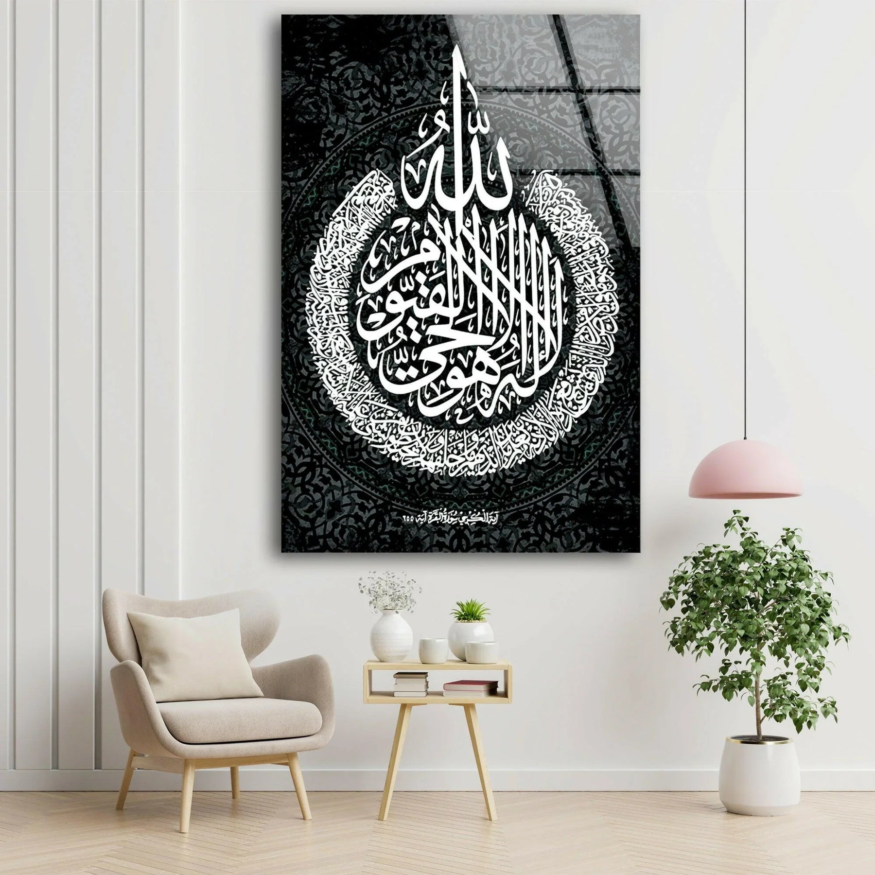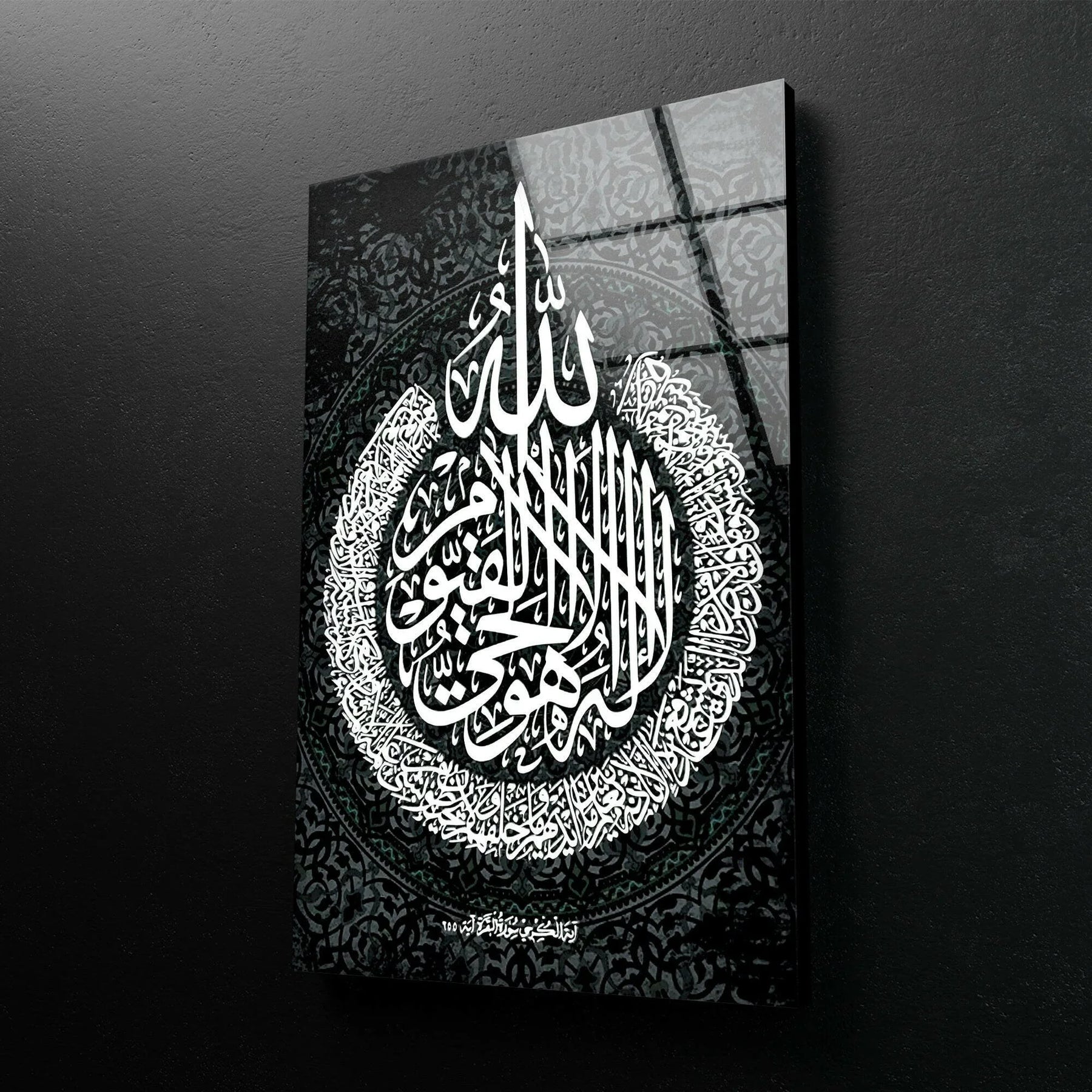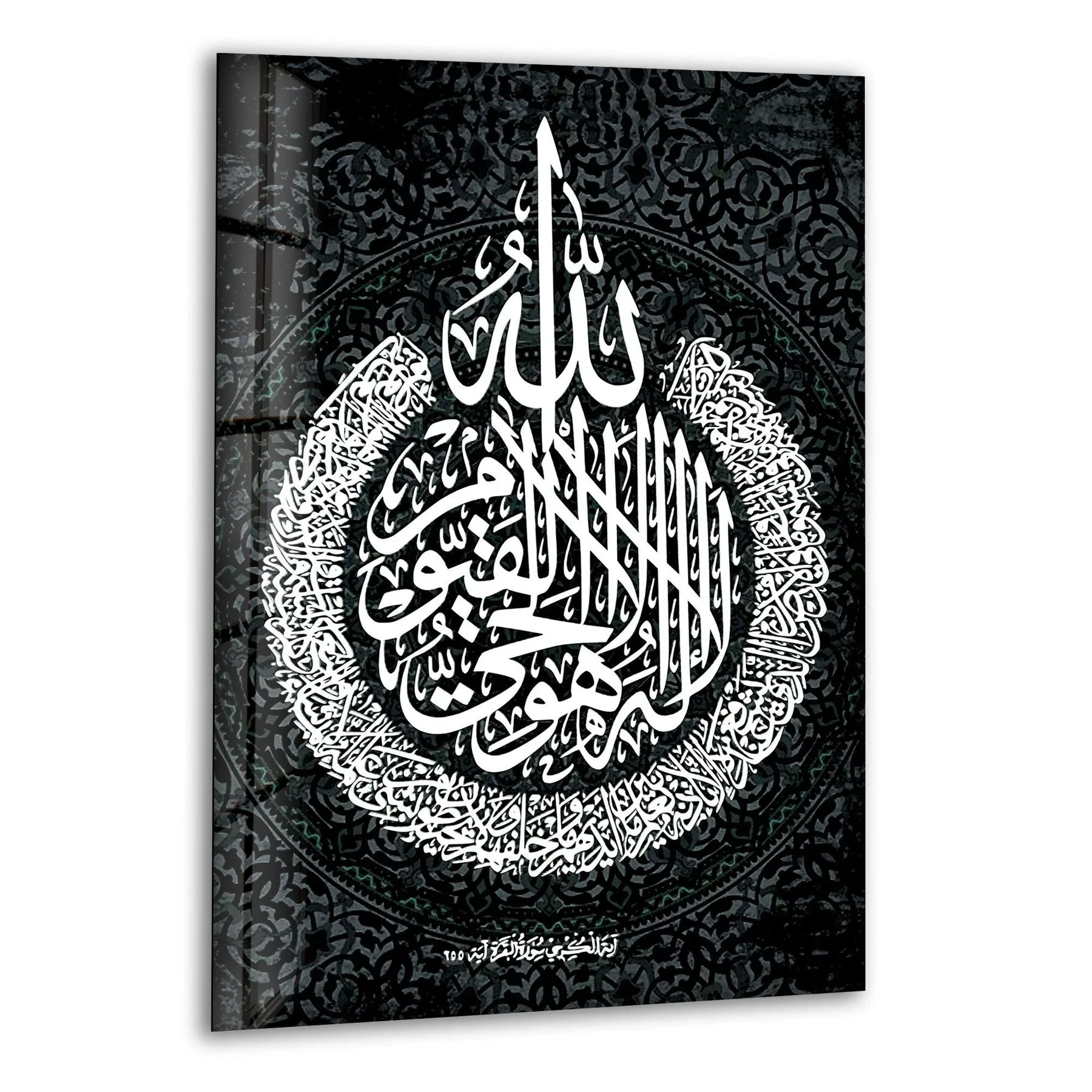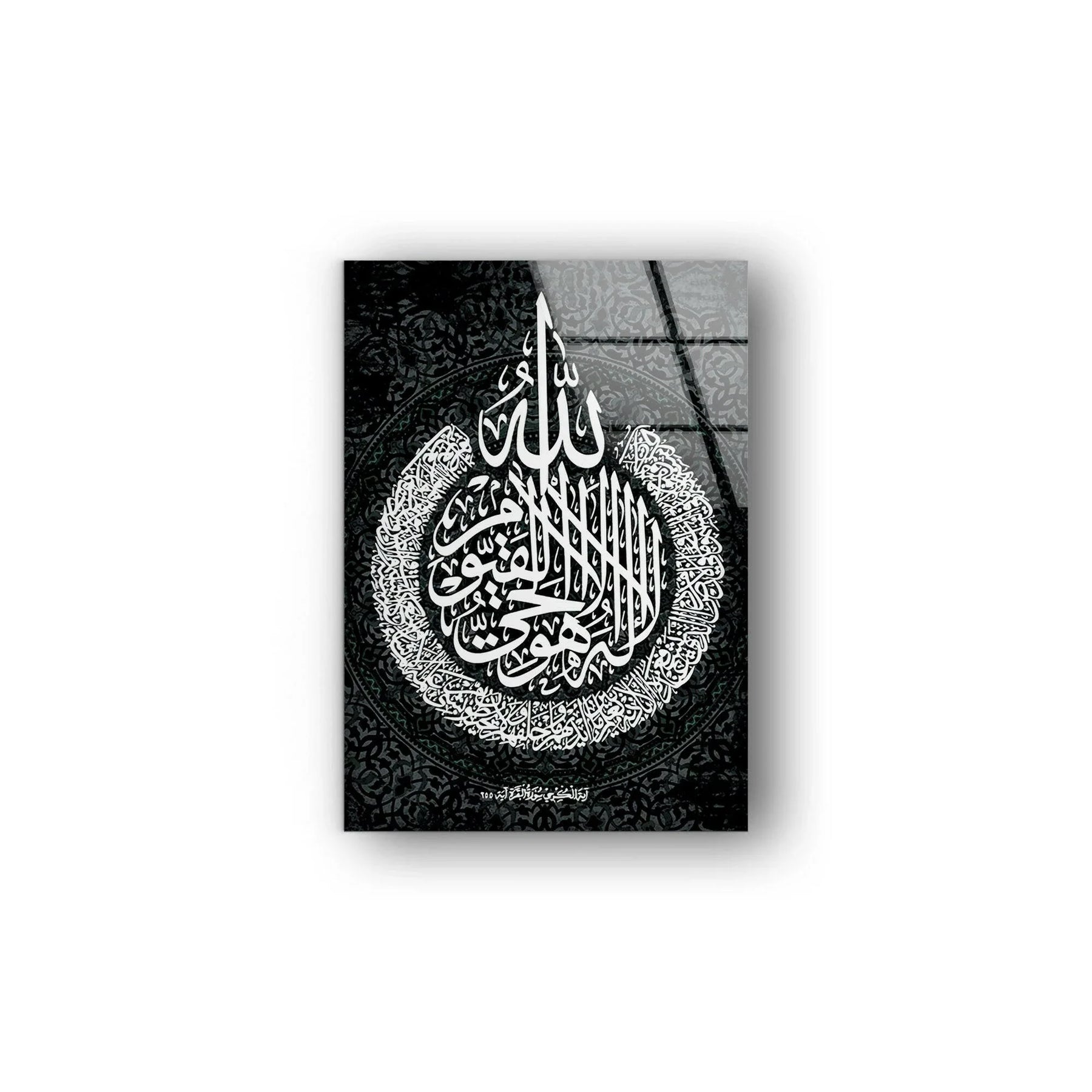 Detailed monochrome Arabic calligraphy arranged in a circular pattern on premium glass wall art.