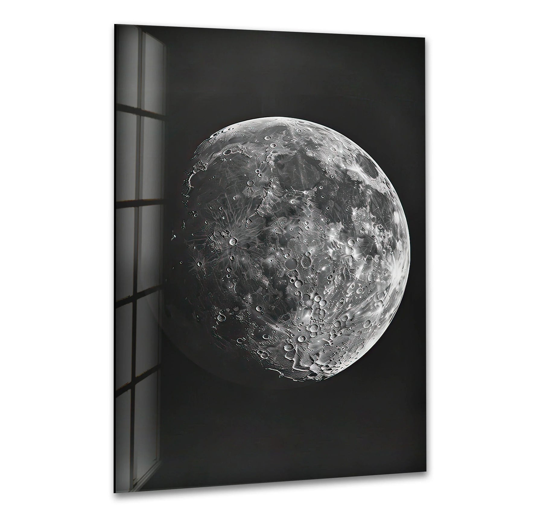 Monochrome lunar artwork on tempered glass showing the moon’s surface in high-contrast detail.