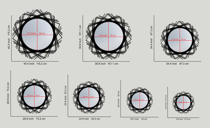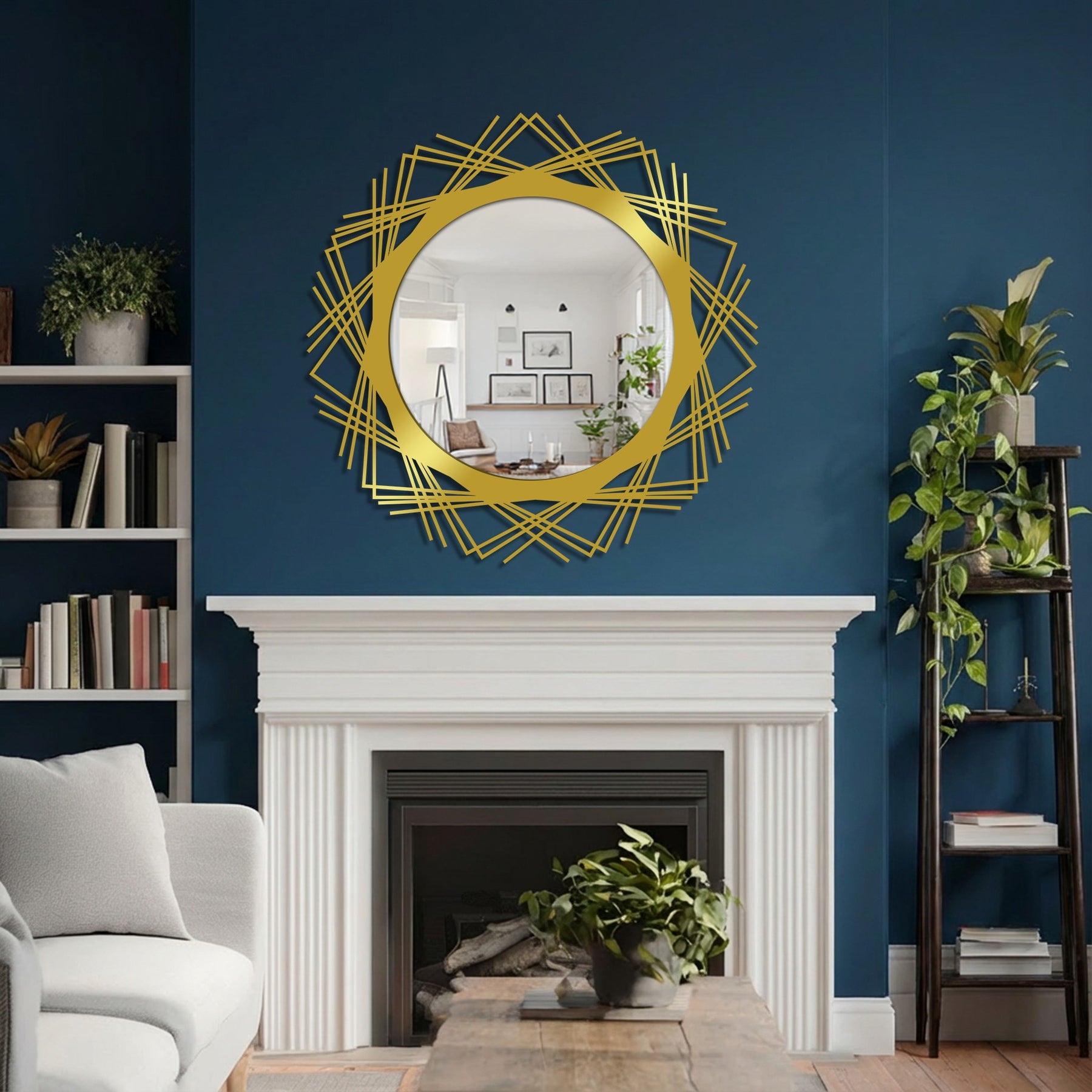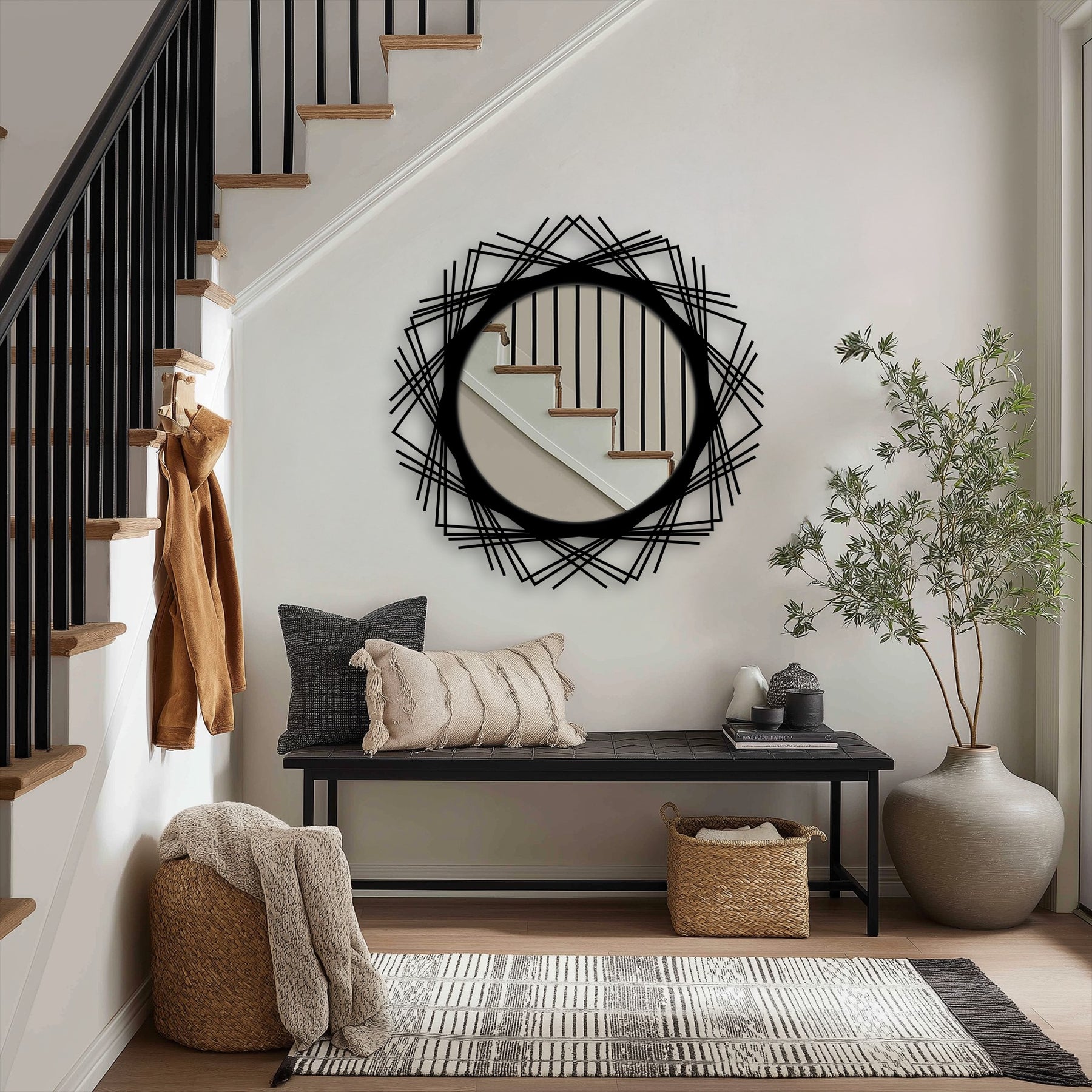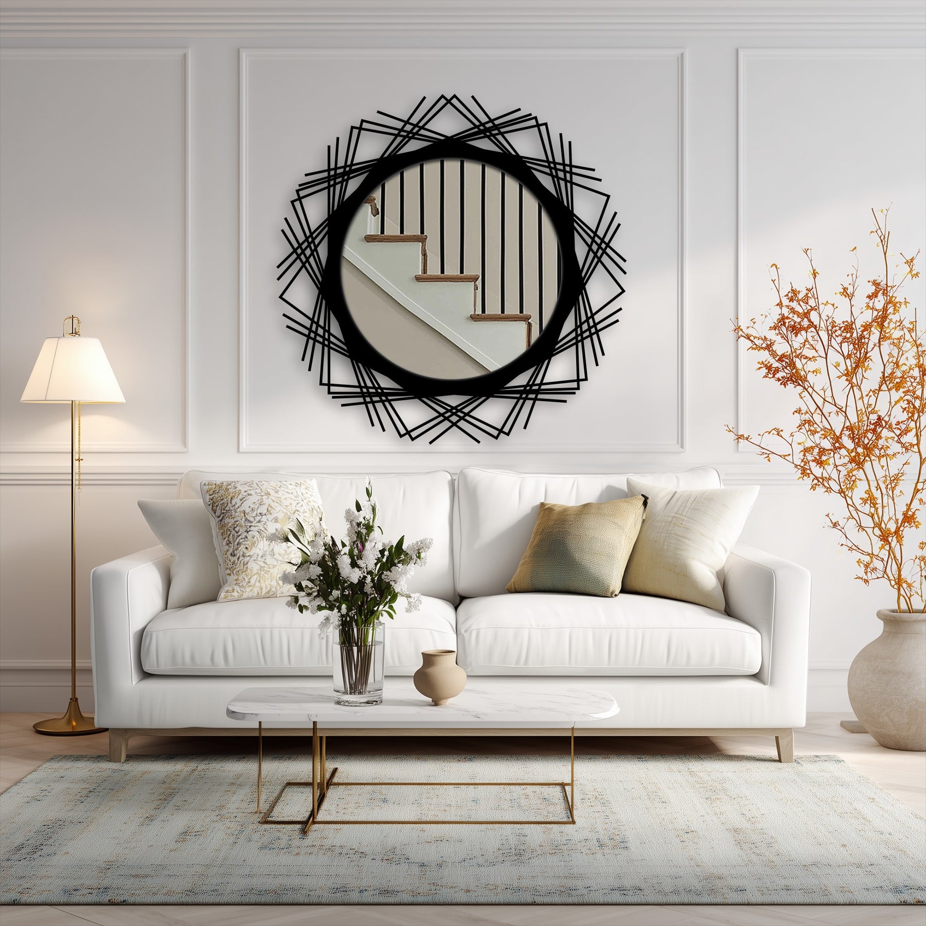 This contemporary round wall mirror is wrapped in a striking frame of overlapping linear elements, creating movement, depth, and architectural clarity. The intersecting lines form a bold geometric halo, drawing attention to the smooth circular mirror center while maintaining a clean, minimalist presence.