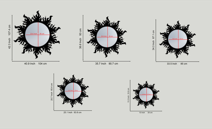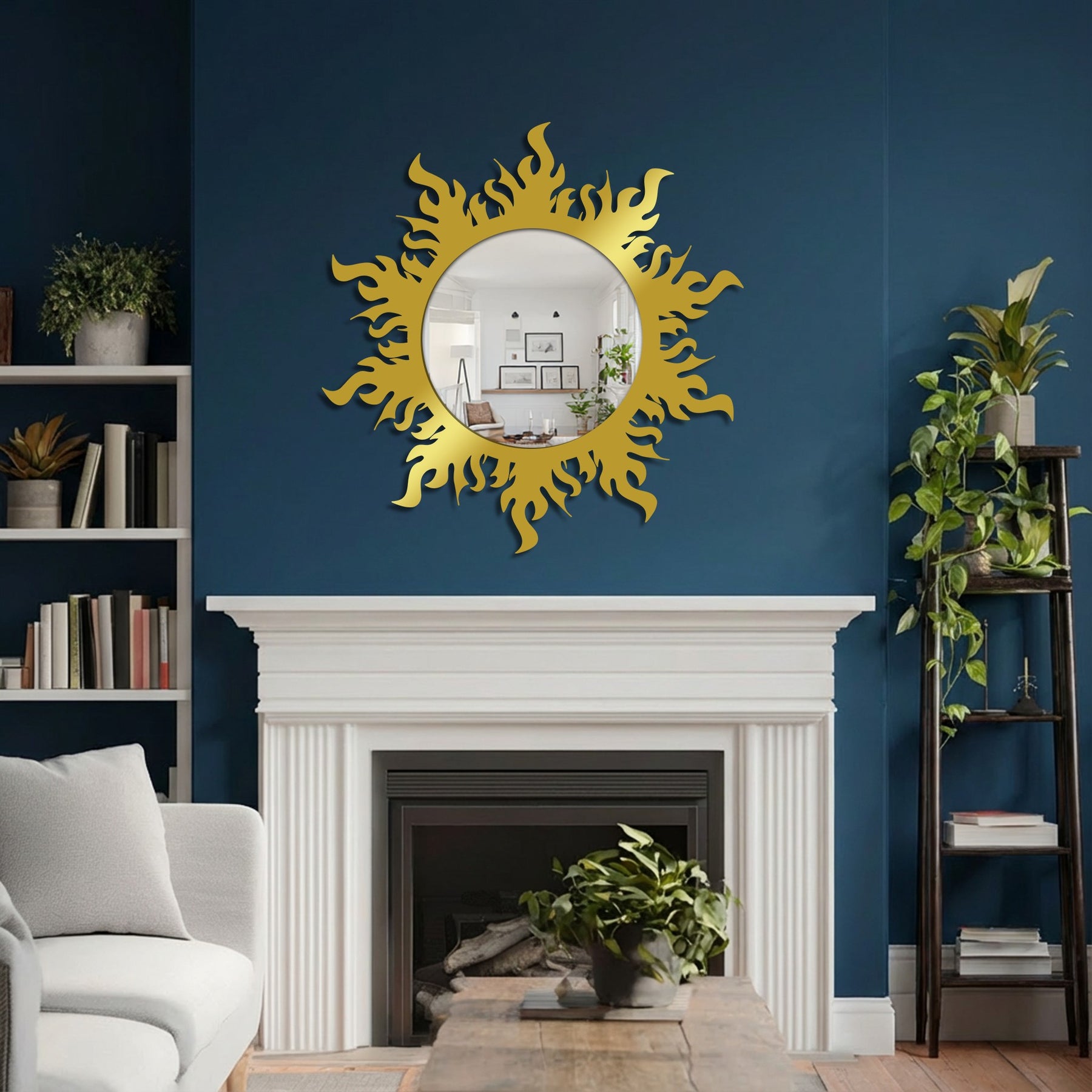 This captivating round wall mirror features an expressive flame-inspired crown that radiates outward, creating a bold focal point with fluid, organic movement. The irregular outer form contrasts beautifully with the smooth circular mirror center, delivering a striking blend of artistic energy and modern balance.