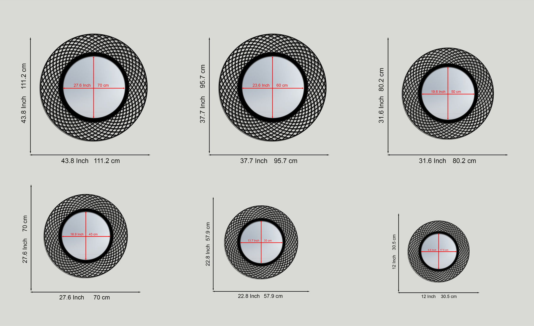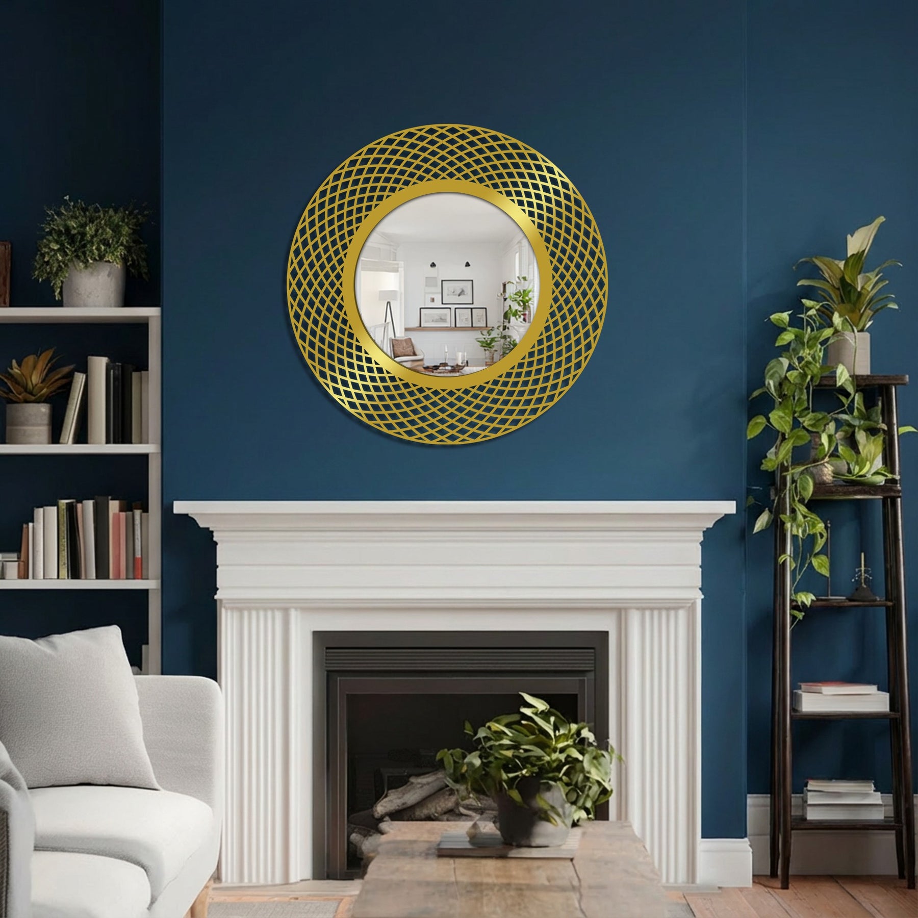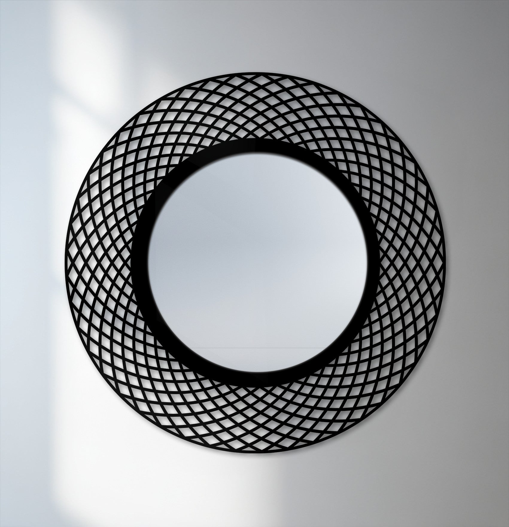 This elegant round wall mirror showcases an interwoven geometric frame that brings rhythm and balance to modern interiors. The layered circular pattern creates a sense of depth and motion, beautifully framing the smooth mirror center while maintaining a clean, contemporary presence.