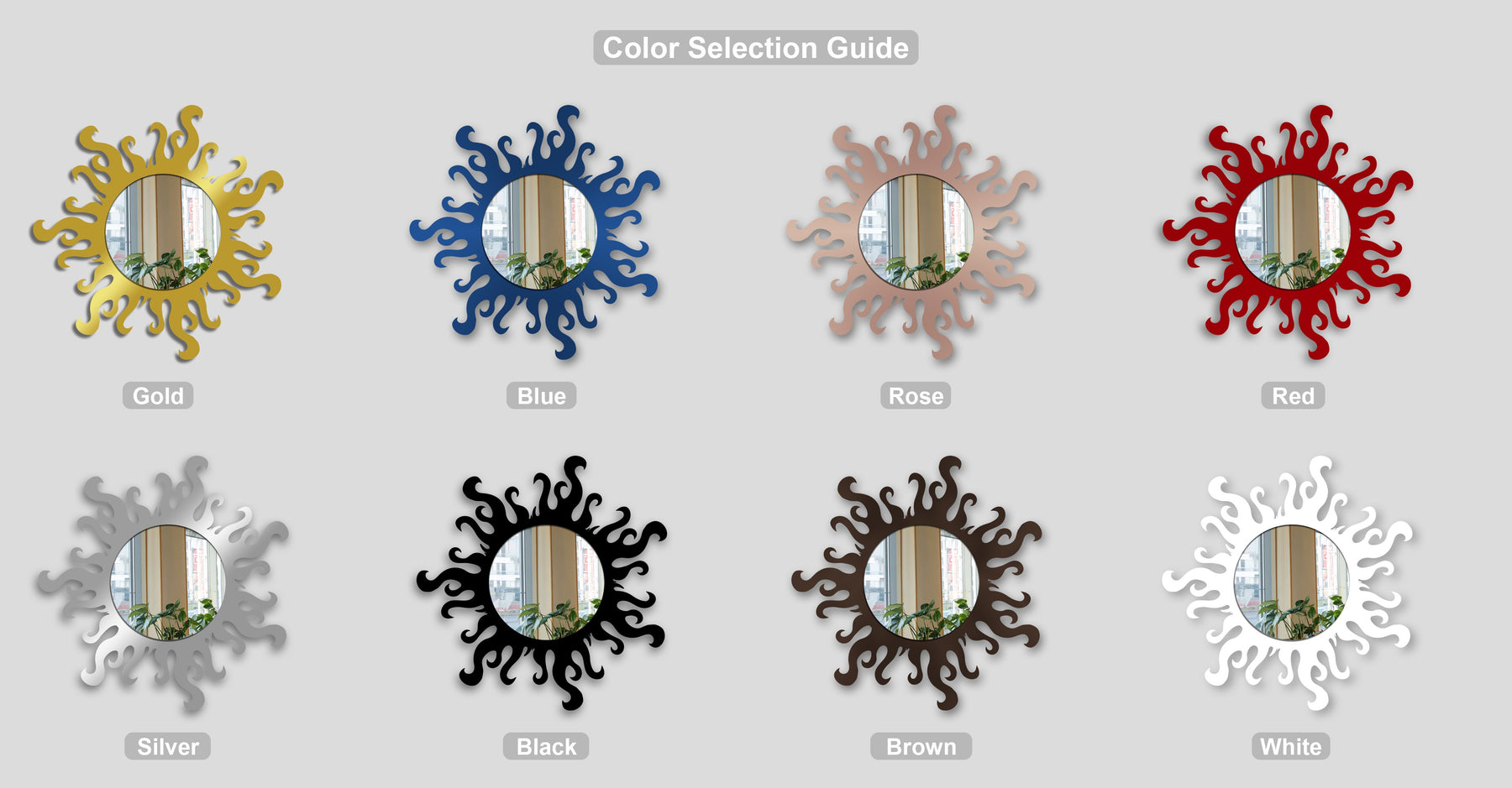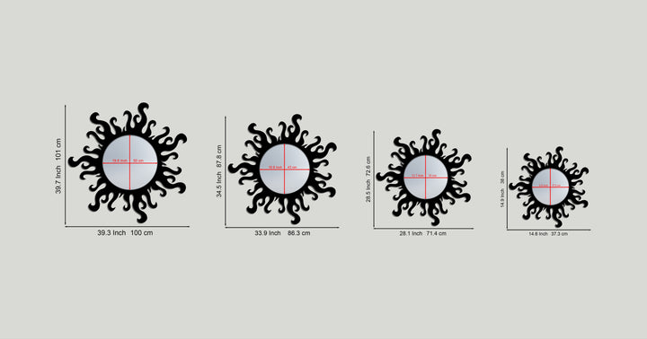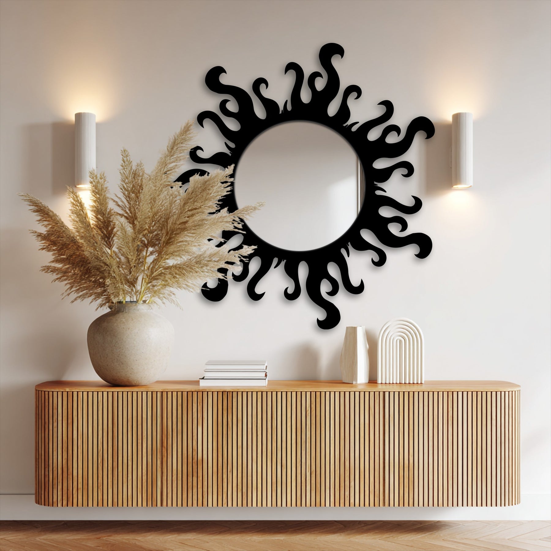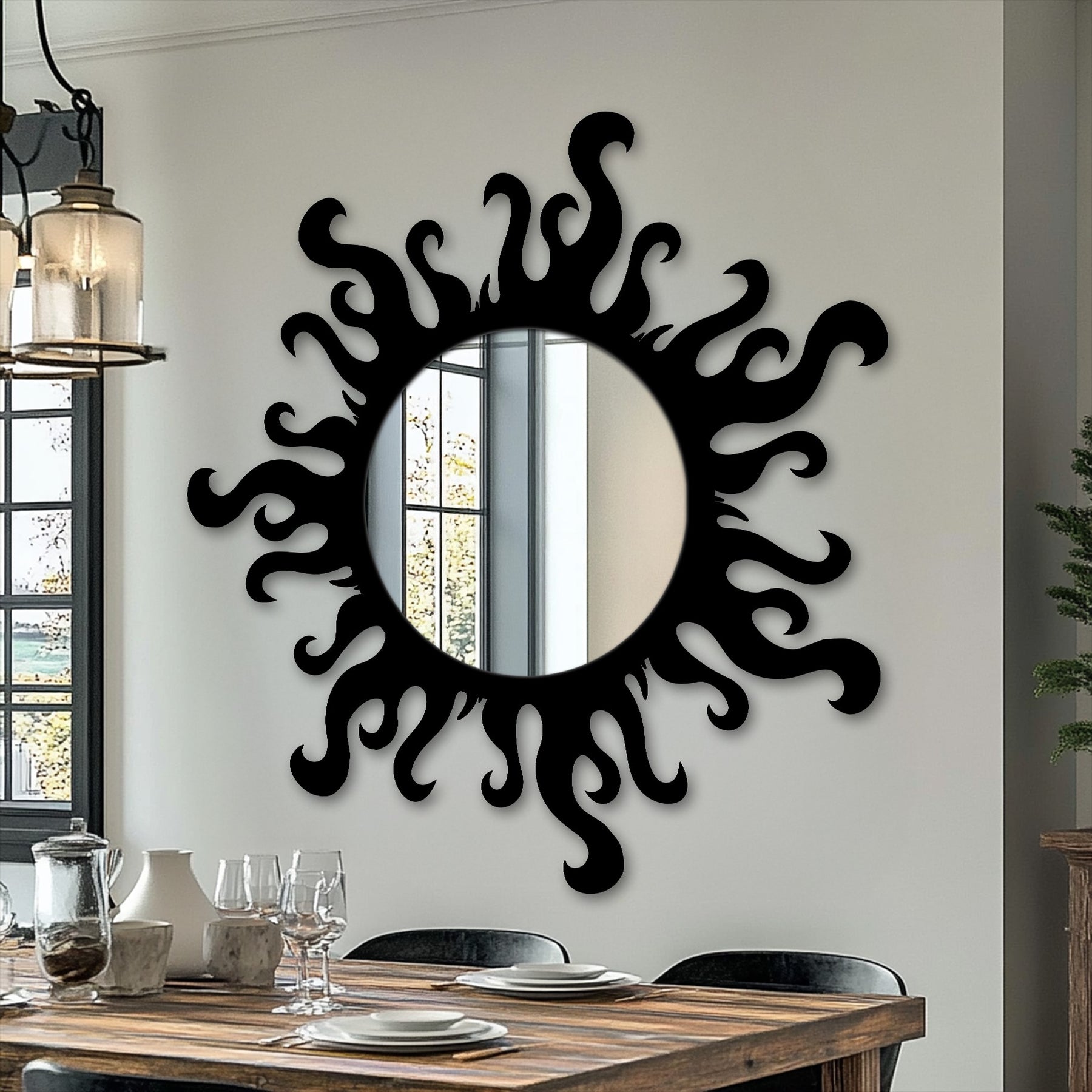 This striking round wall mirror features a bold flame-inspired outer form that instantly transforms any interior into a statement space. The flowing, irregular silhouette surrounds a clean circular mirror center, creating a dynamic contrast that blends artistic movement with modern elegance.