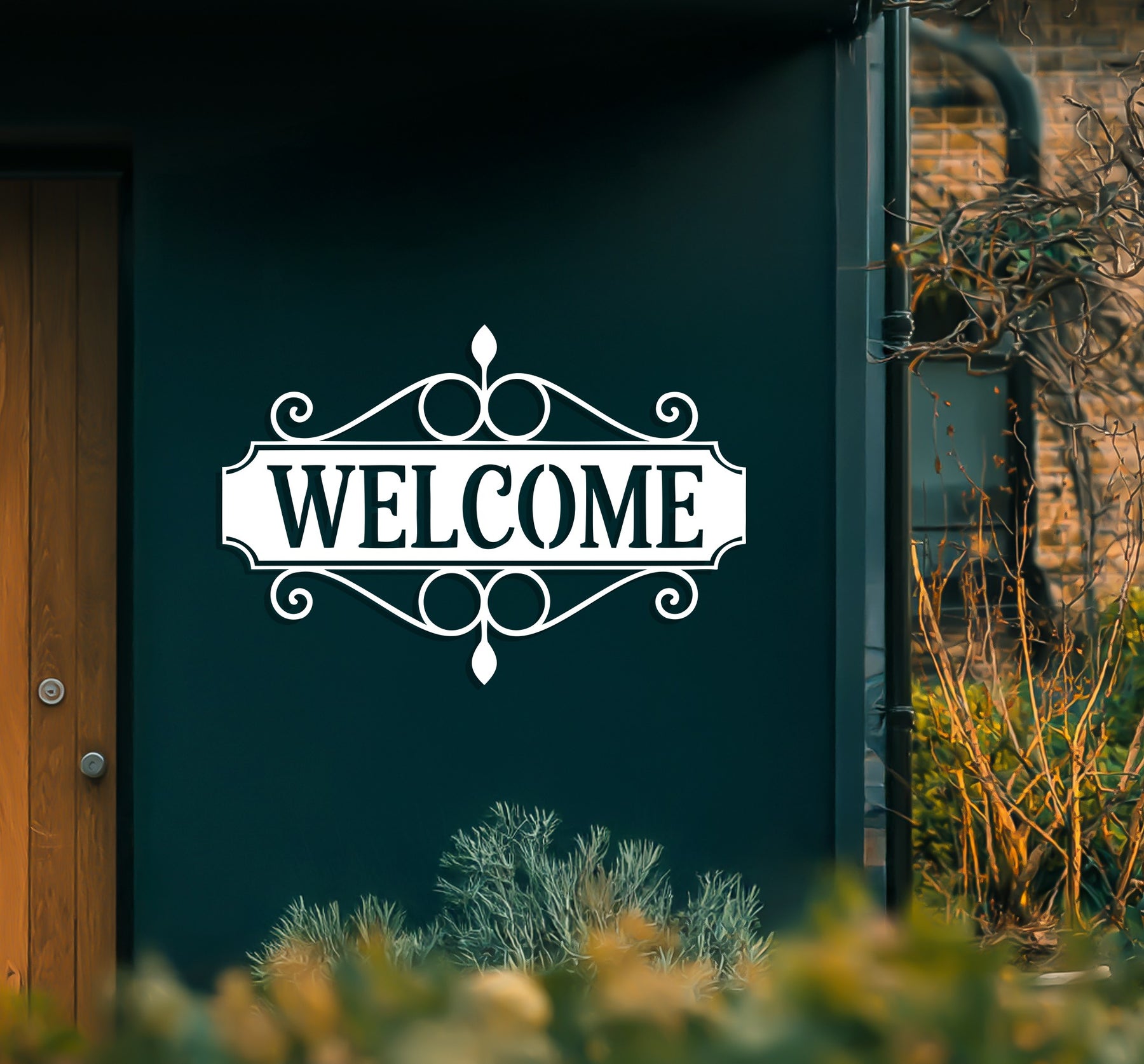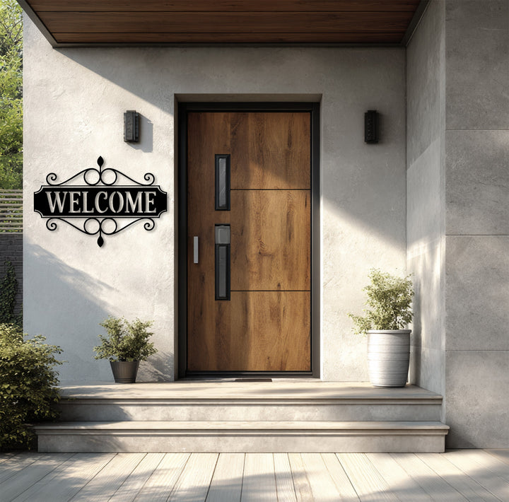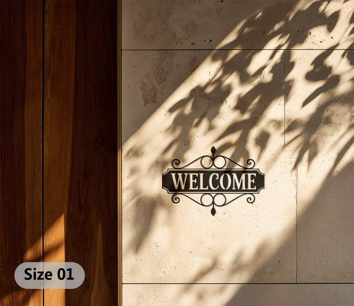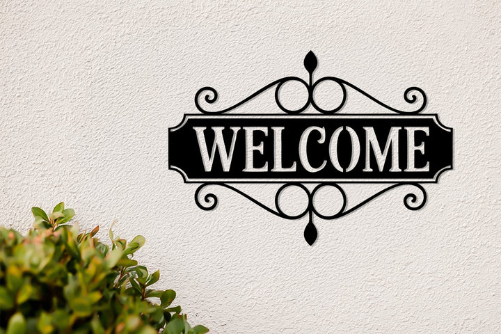 Elegant welcome metal plaque with scroll design