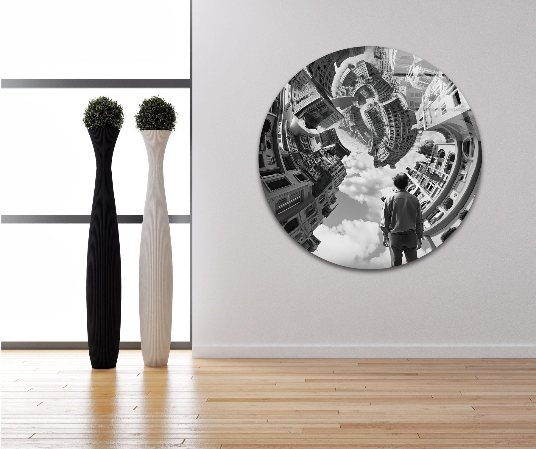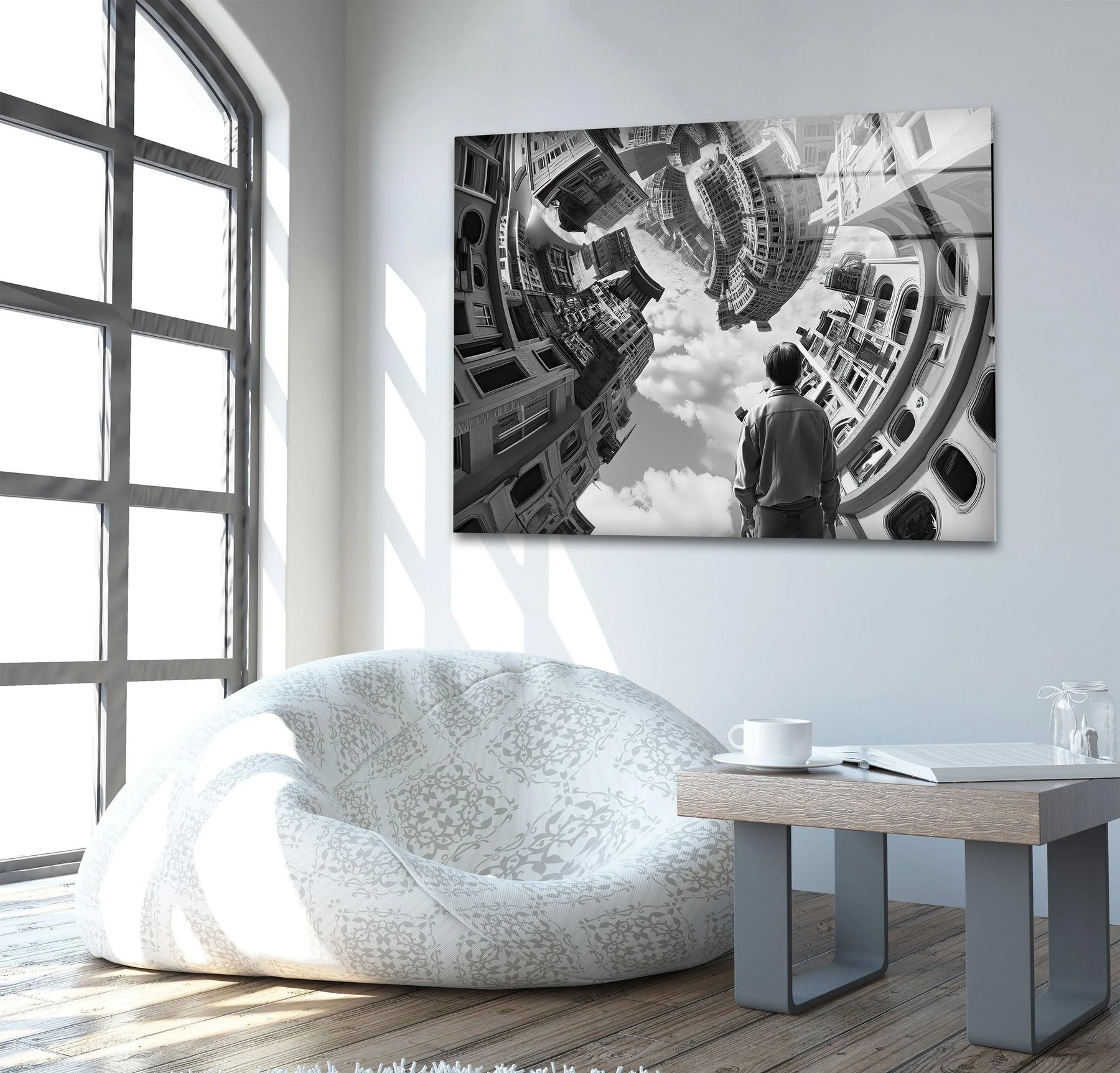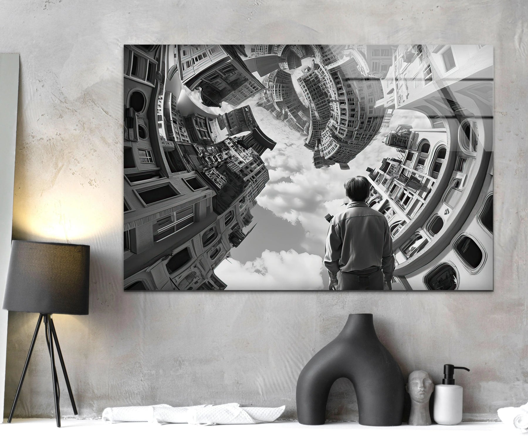 Surreal glass wall art of a twisting cityscape with an observing figure.