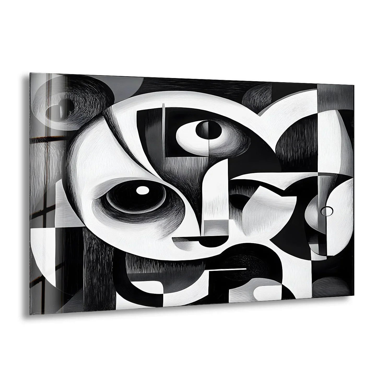 Black and white glass wall art featuring an abstract cubist face with bold geometric shapes and expressive eyes.