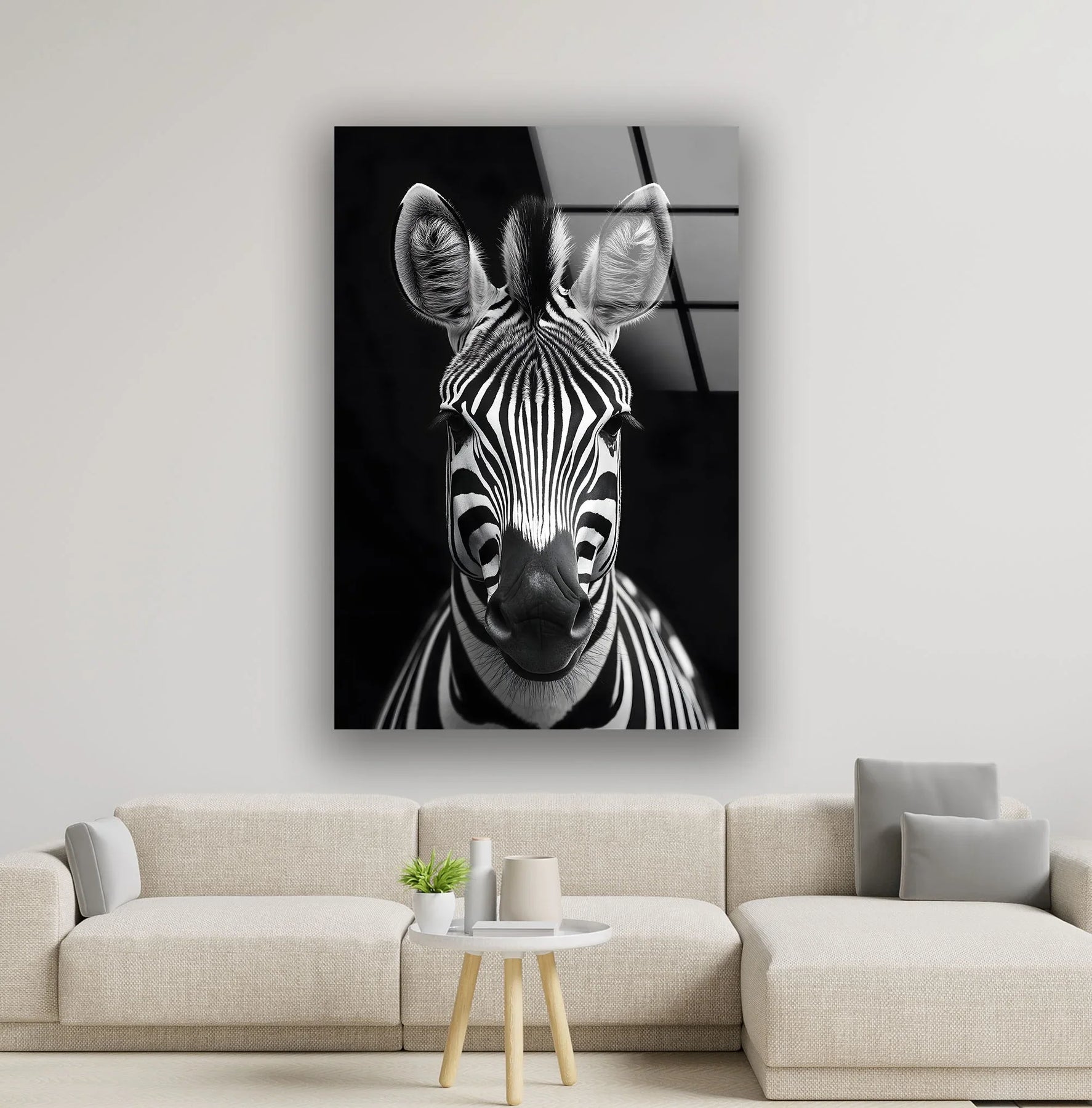 Monochrome zebra artwork on tempered glass showcasing the animal’s symmetrical stripe pattern and expressive ears.