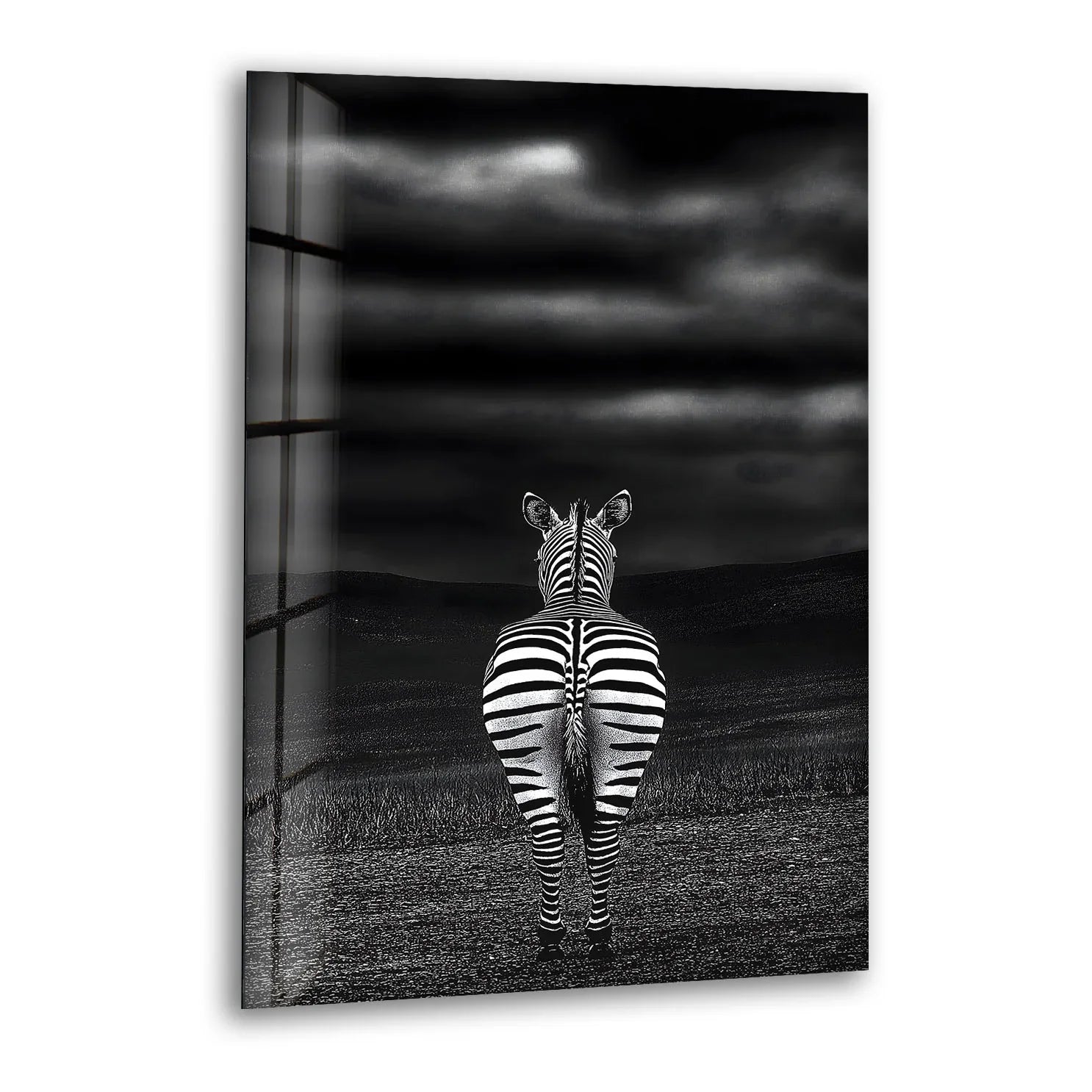 Black and white glass wall art featuring a zebra standing alone, viewed from behind under a dramatic cloudy sky.