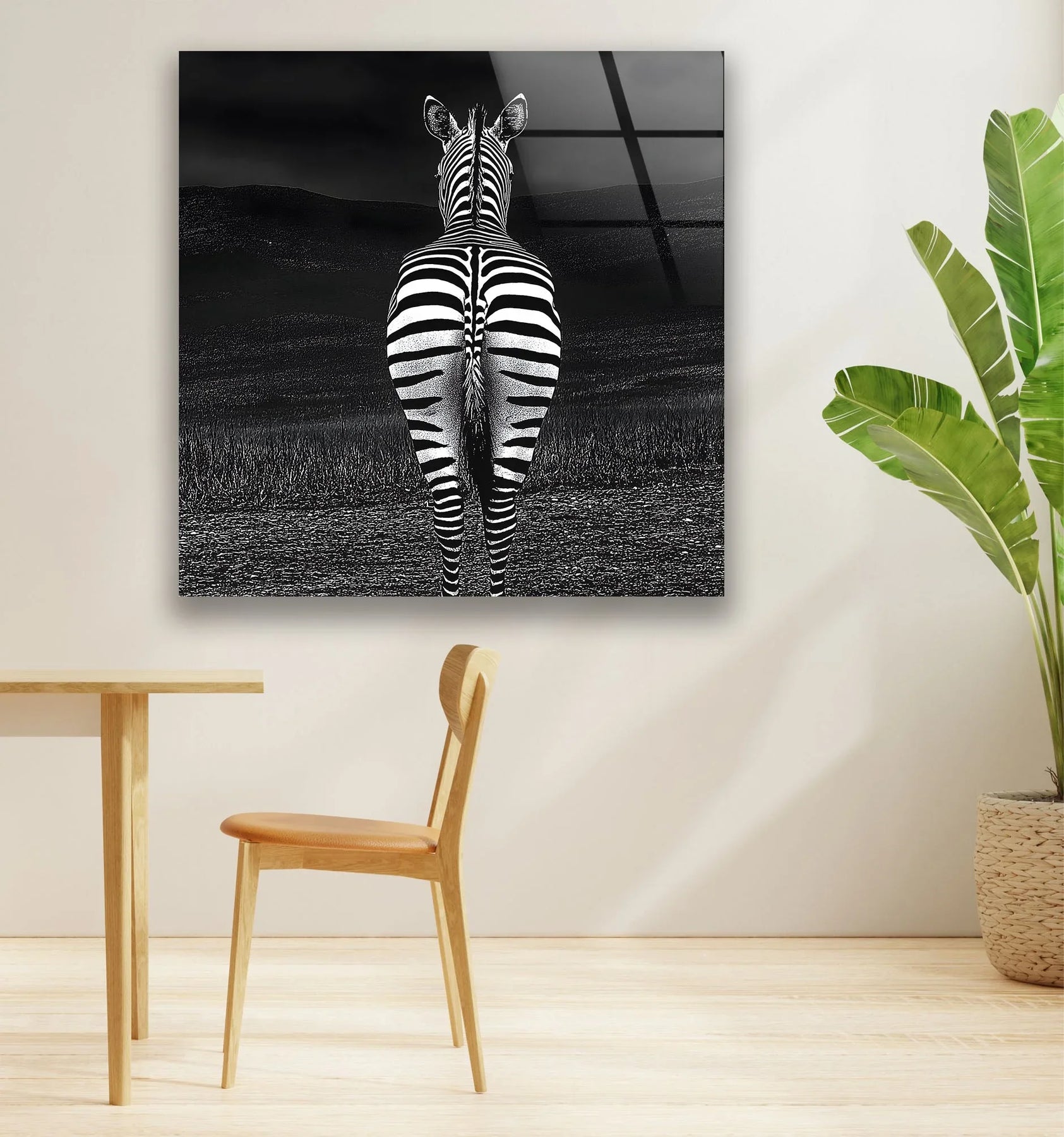 Grayscale wildlife artwork on tempered glass with a rear-view zebra and textured landscape.