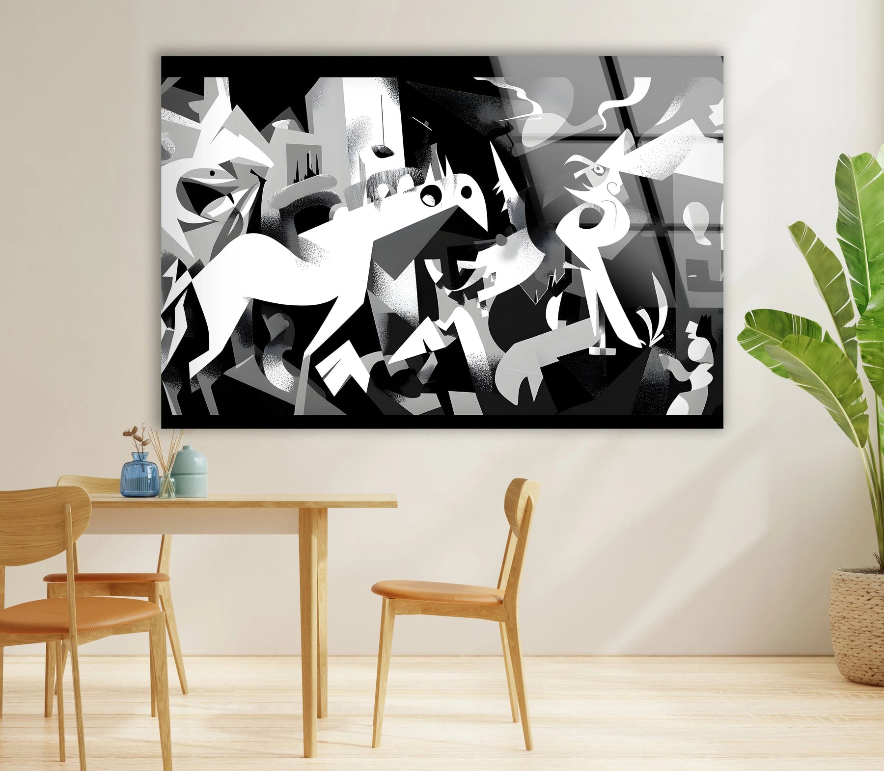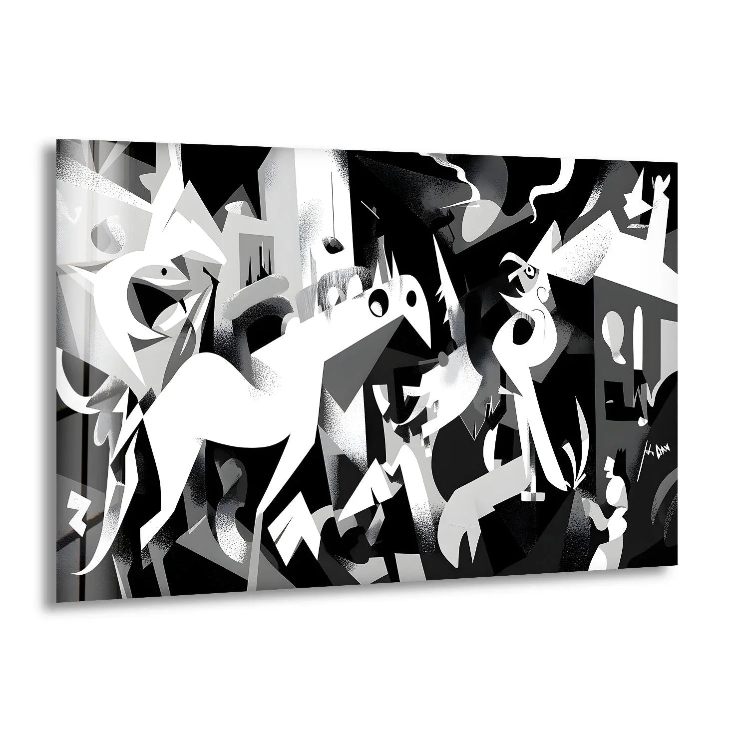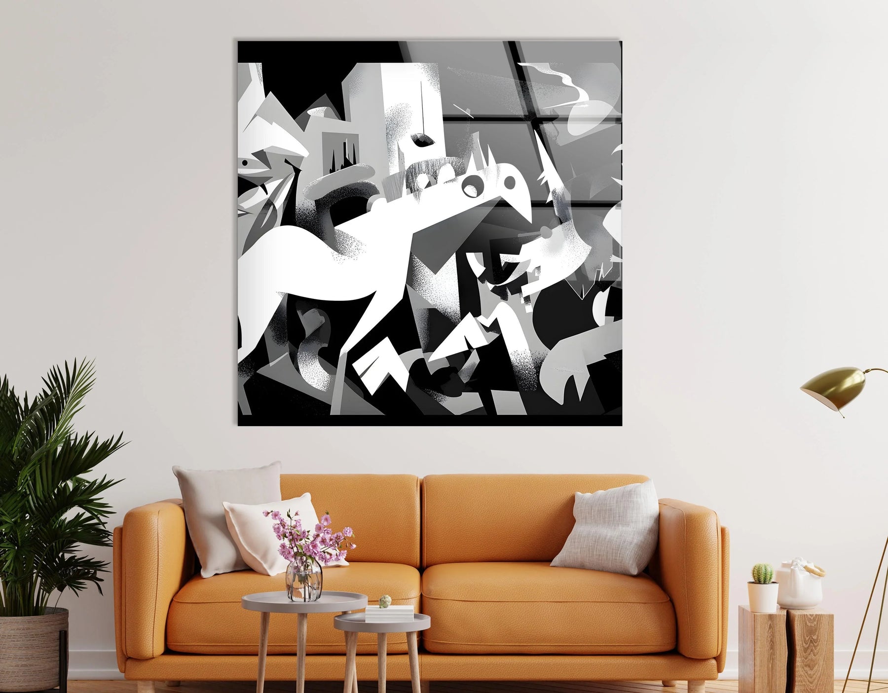 Monochrome abstract artwork on tempered glass with stylized horses and fragmented geometric shapes.