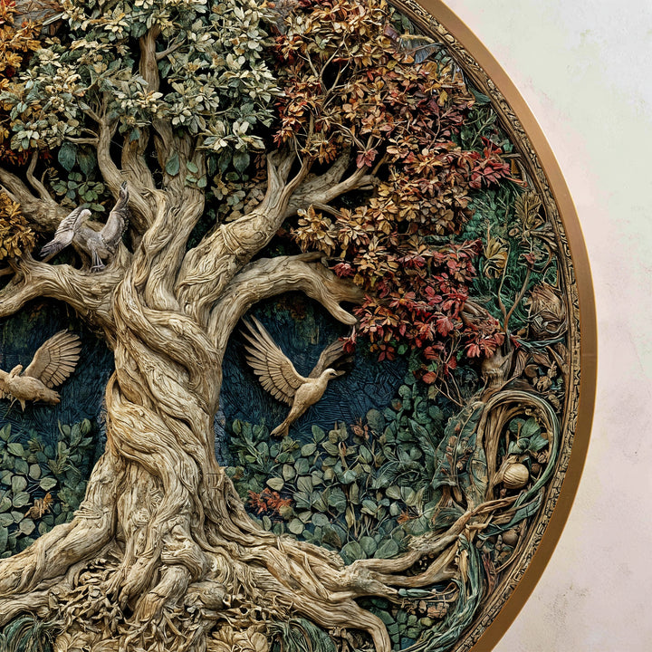 Ce captivant rond en bois Tableau Peinture à l’huile Cette œuvre met en scène un majestueux arbre centenaire, entouré d'un feuillage luxuriant et d'oiseaux gracieux en plein vol. Les branches finement sculptées, l'écorce texturée et les feuilles superposées aux tons de vert terreux, de brun chaud et de rouge automnal créent une atmosphère riche et féerique. La composition circulaire renforce l'impression d'équilibre et d'harmonie naturelle, faisant de cette œuvre un magnifique point focal pour les salons, les chambres, les coins lecture ou les intérieurs inspirés par la nature.