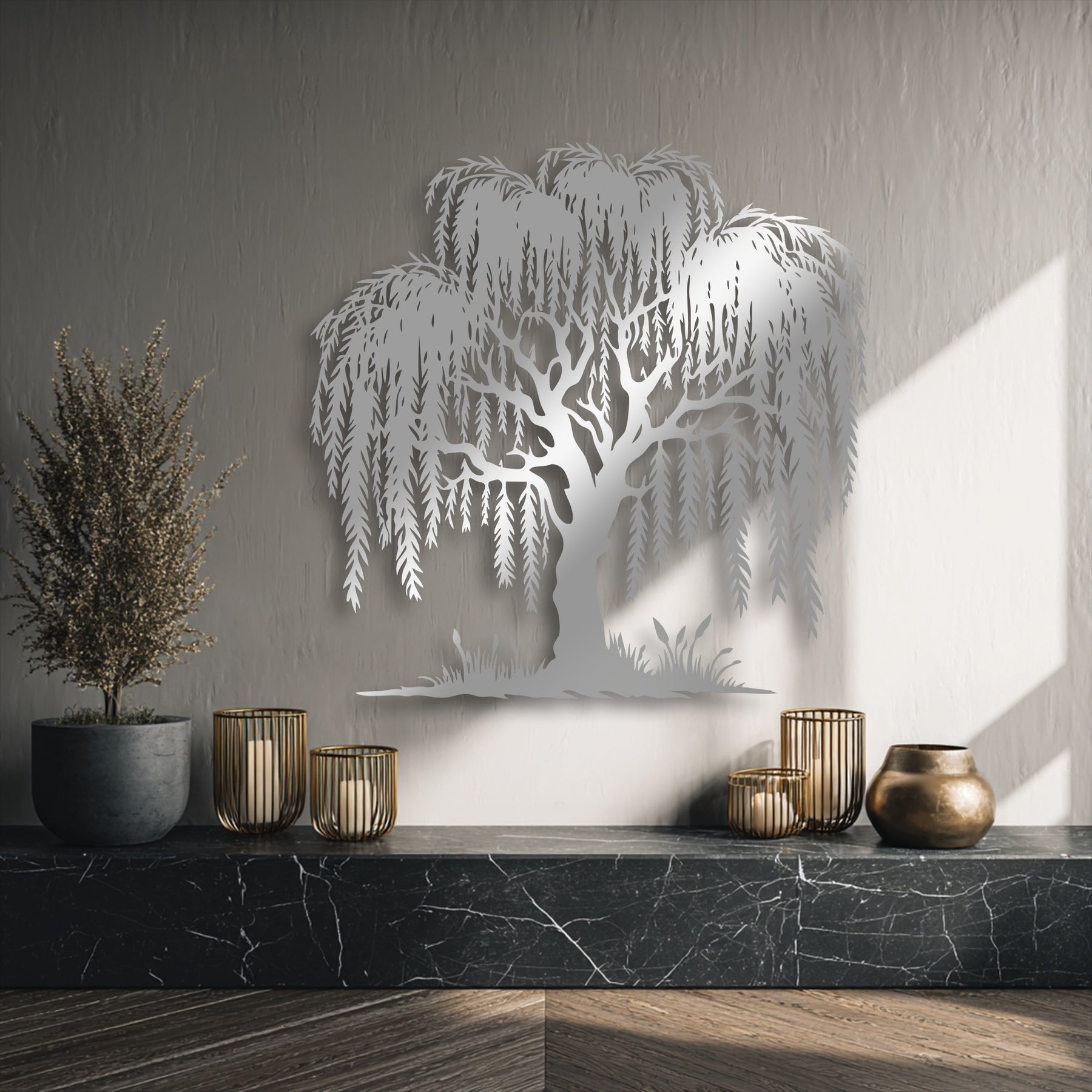 The brightly lit upper right wall highlights the lustrous, intricate willow tree silhouette, a beautiful piece of decorative metal art.