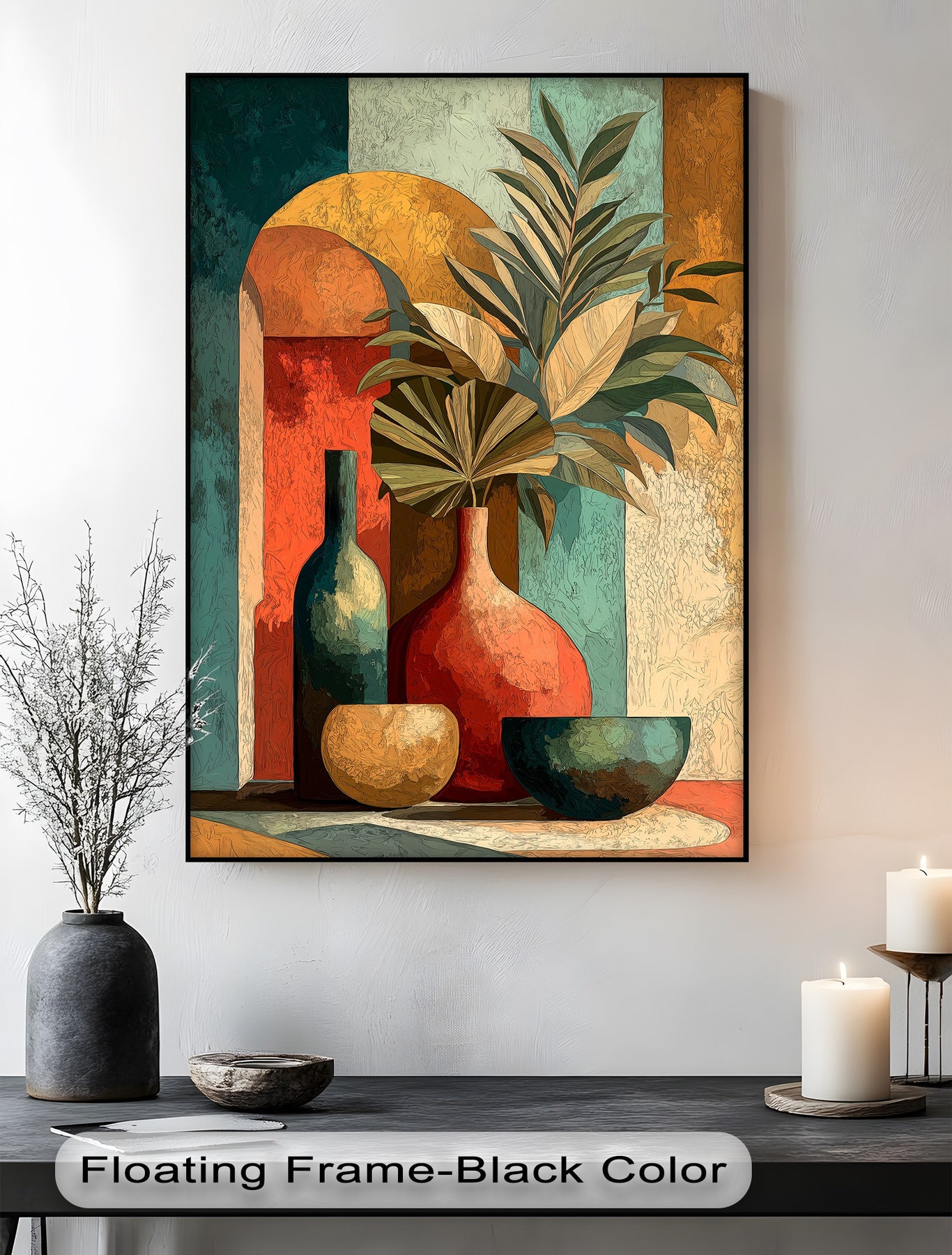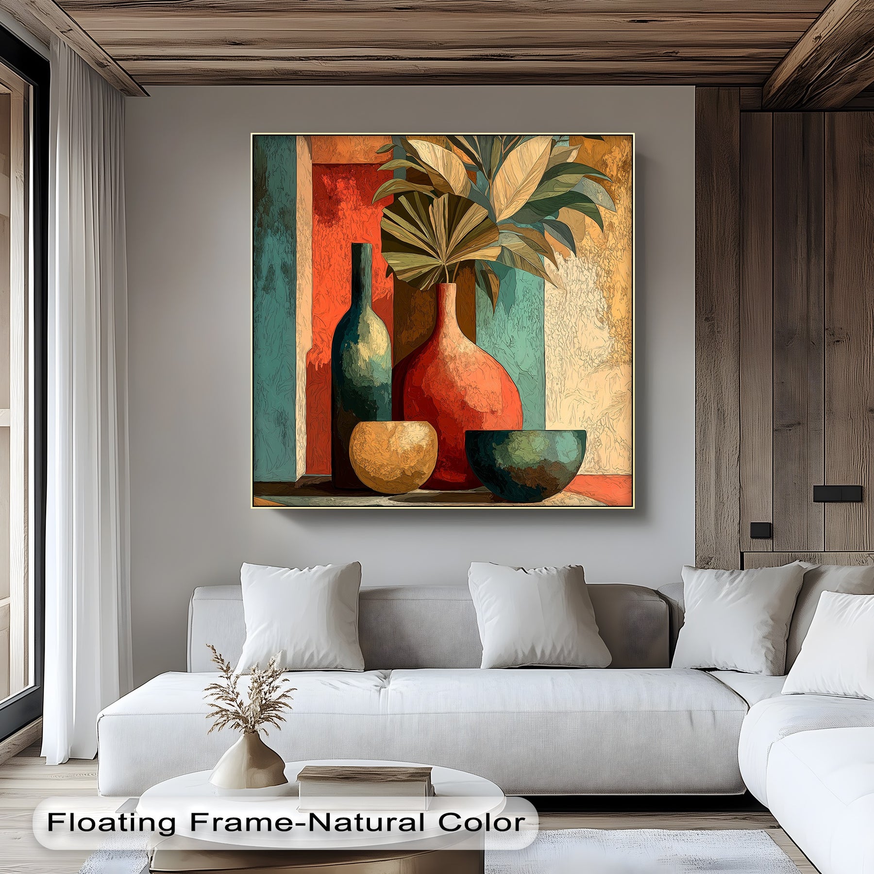 Foreground detail highlights a still life canvas painting featuring a vase with tropical leaves, showcasing the abstract botanical design and colorful composition.