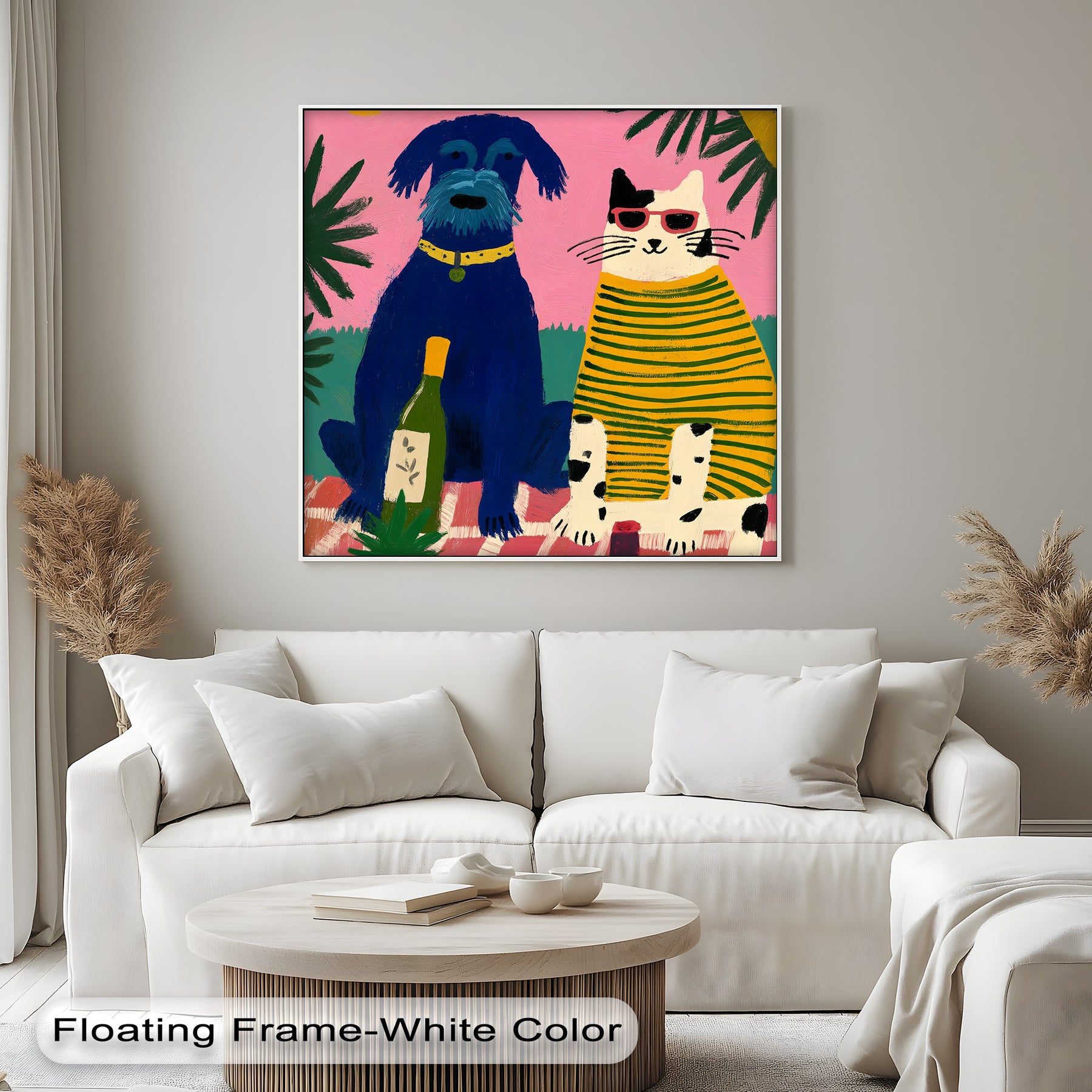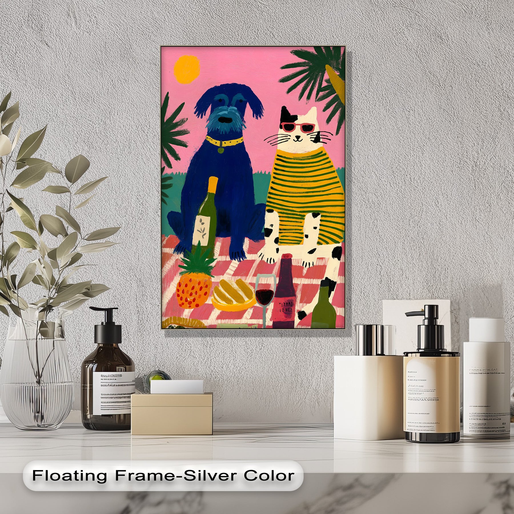 Bright and cheerful, this playful dog and cat picnic framed canvas print evokes a fun, vibrant mood with its colorful pop art style.