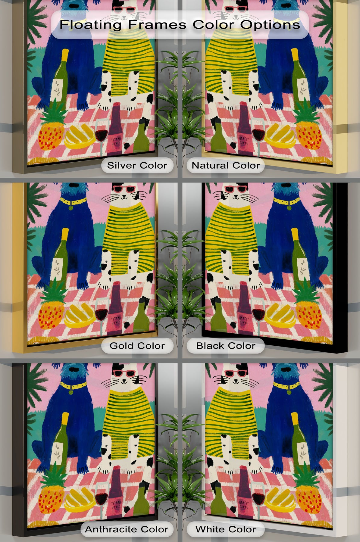 Showcasing the depth and layers of this 'Playful Dog & Cat Picnic' canvas art prints, highlighting its floating frame color options for a gallery-worthy display.