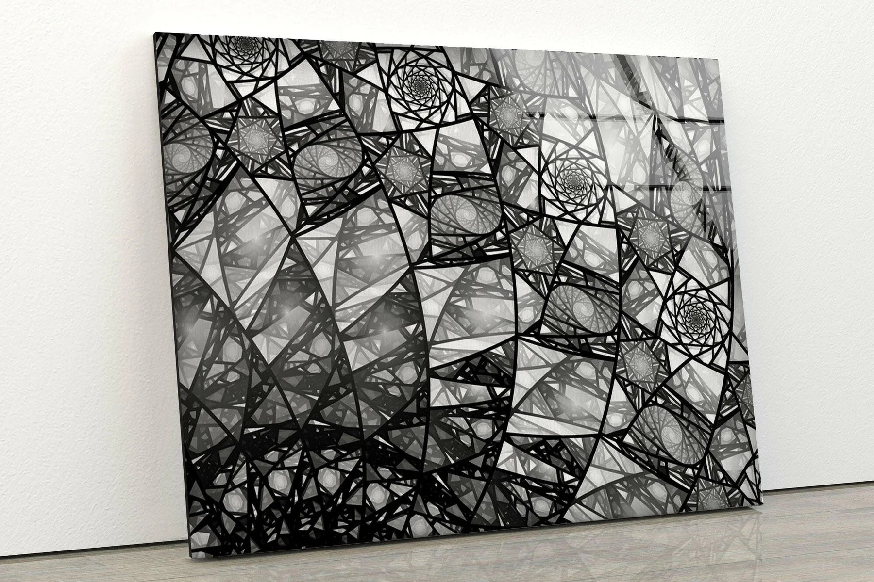 Intricate black and white fractal pattern printed on modern glass wall art.