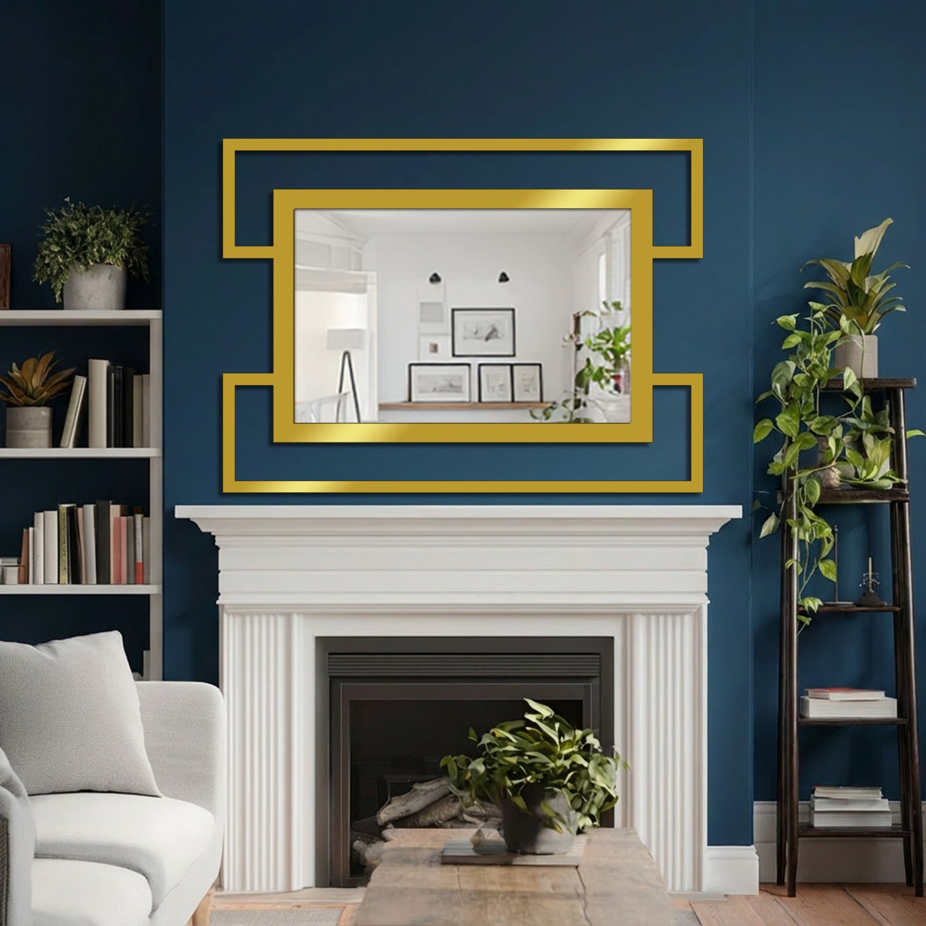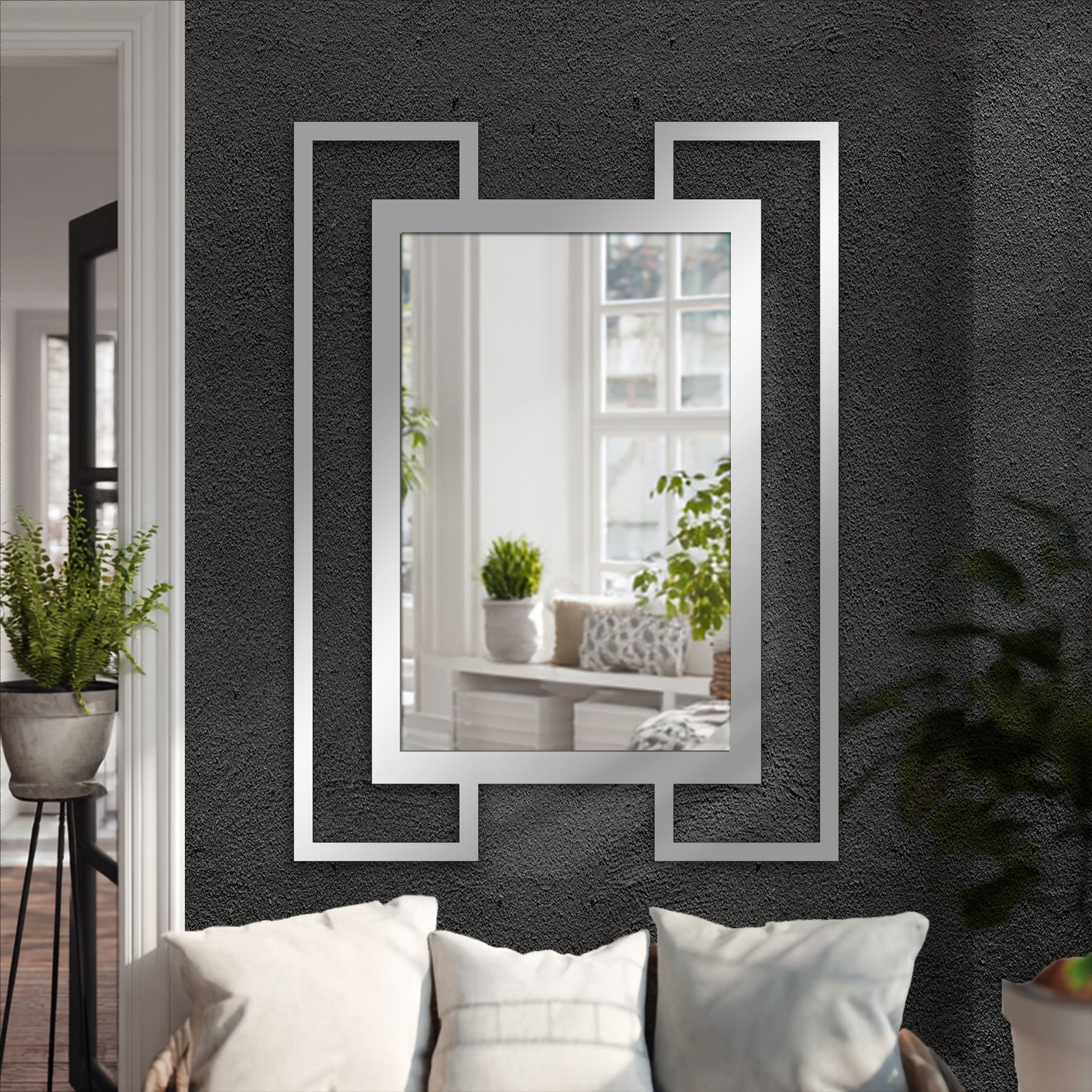 Ce géométrie à double cadre Décoration Murale Métal miroir Ce meuble apporte un équilibre architectural saisissant aux intérieurs modernes. Conçu avec un miroir rectangulaire intérieur audacieux et un cadre métallique extérieur décalé, il crée un effet de superposition et de suspension à la fois minimaliste et affirmé.