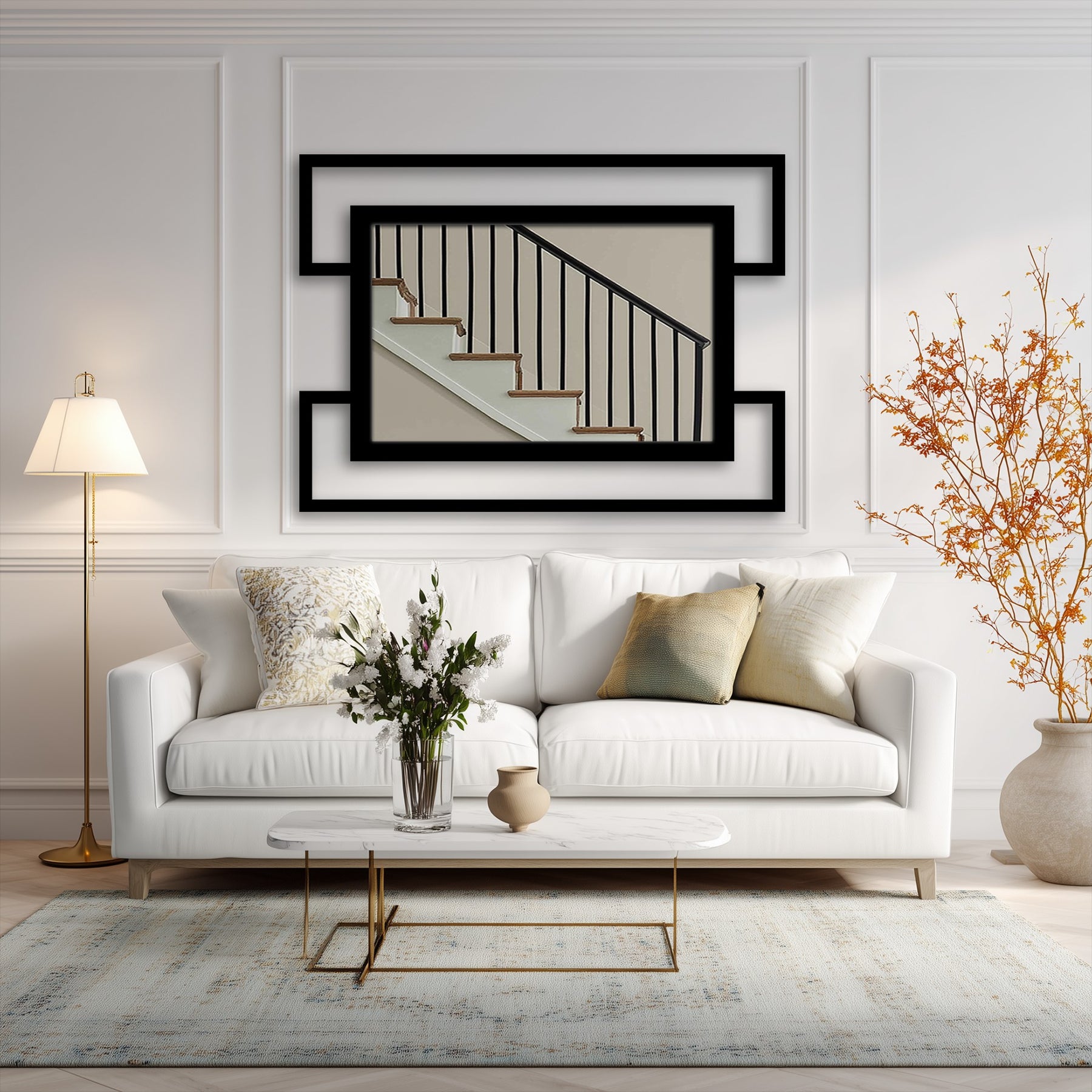 Les lignes robustes du métal noir soulignent la symétrie, tandis que le cadre extérieur décalé apporte profondeur et rythme visuel. Sa géométrie épurée reflète la lumière de façon homogène, donnant aux espaces une impression d'ouverture et de structure, sans ornementation superflue. La finition noire mate renforce son caractère contemporain et s'harmonise parfaitement avec les styles de décoration modernes, industriels et minimalistes.