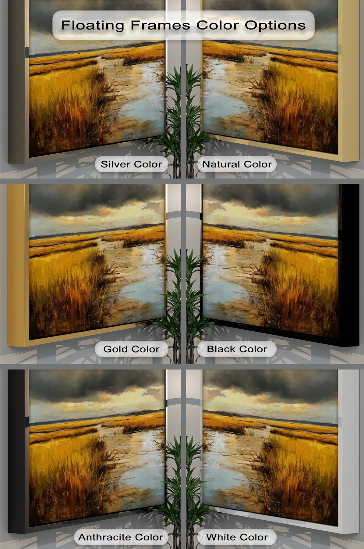 Golden hues define this landscape canvas print of a marsh and dramatic storm clouds, showcasing an exquisite canvas painting with a floating anthracite frame.