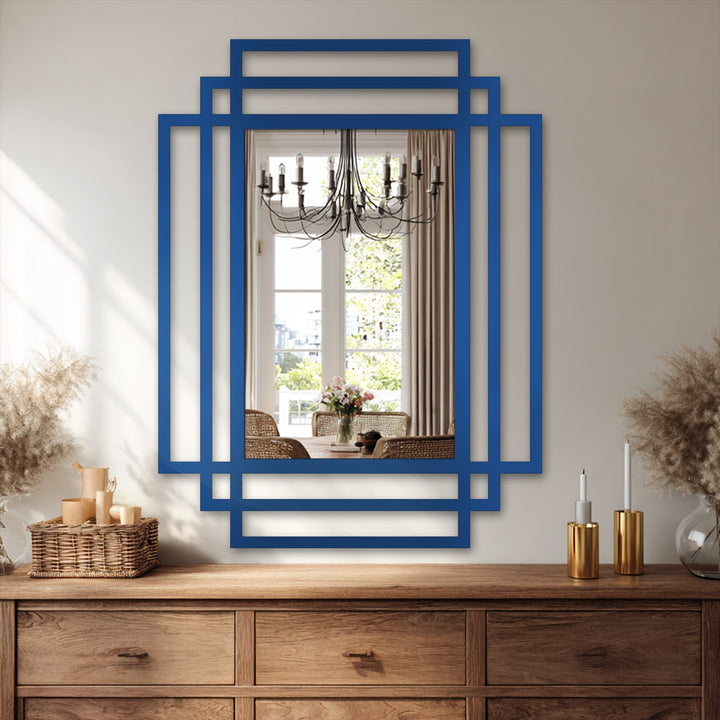 Ce cadres rectangulaires superposés Décoration Murale Métal miroir Cette œuvre est une interprétation saisissante de l'équilibre architectural moderne. Plusieurs cadres rectangulaires se superposent en gradins décalés, créant profondeur, mouvement et une forte impression de symétrie autour de la surface centrale du miroir.