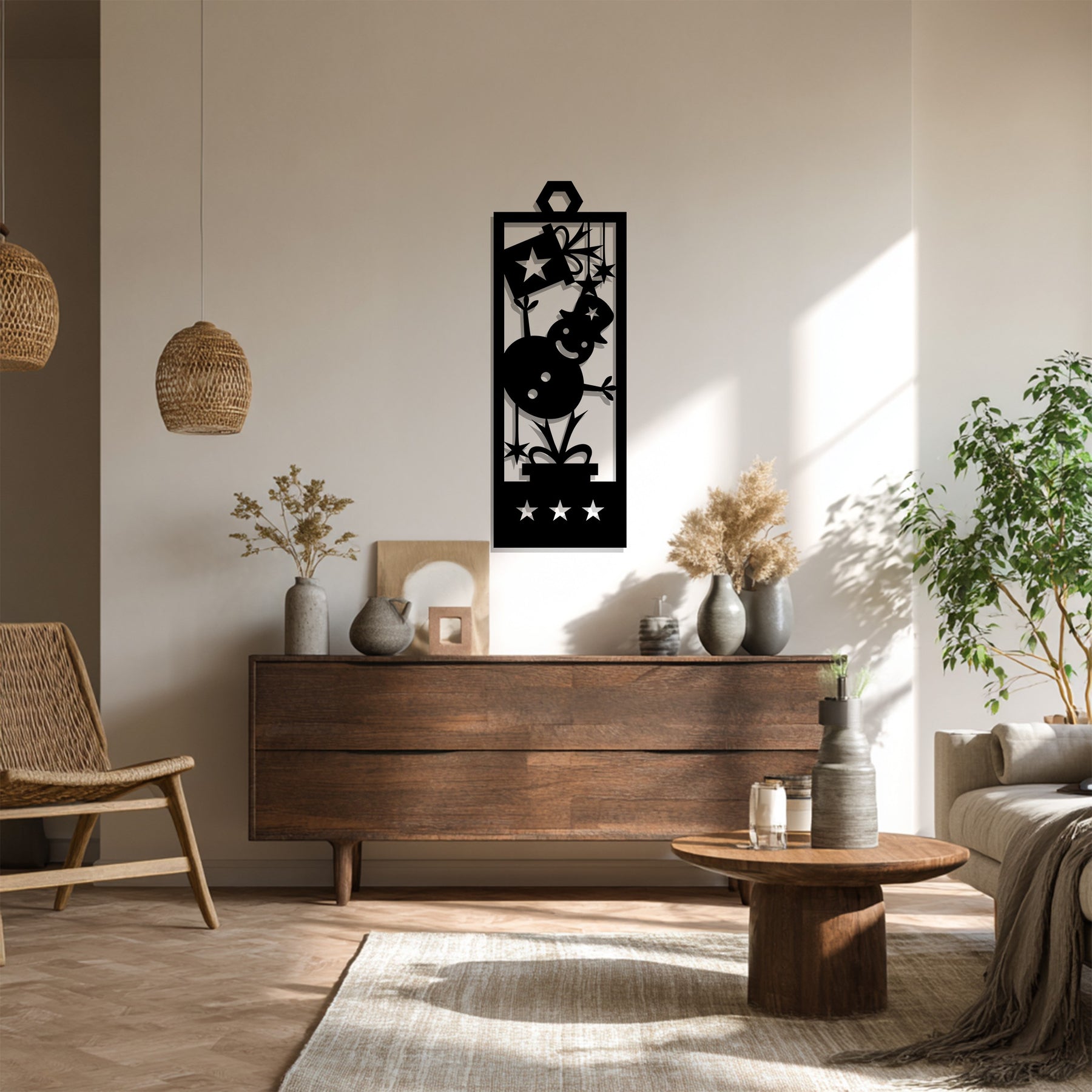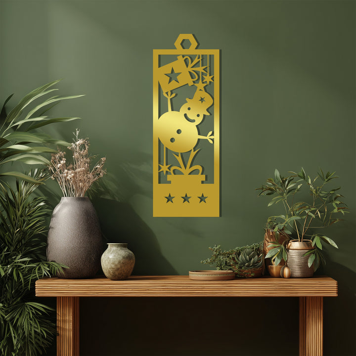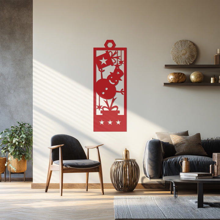 Festeggia la magia del Natale con Pupazzo di neve gioioso Decorazioni Murali in MetalloCon un allegro pupazzo di neve che tiene in mano una scatola regalo, circondato da stelle scintillanti, questo design festivo porta calore, felicità e l'essenza giocosa delle festività natalizie nella tua casa. La disposizione verticale lo rende perfetto per pareti strette, ingressi o accanto a un albero di Natale.