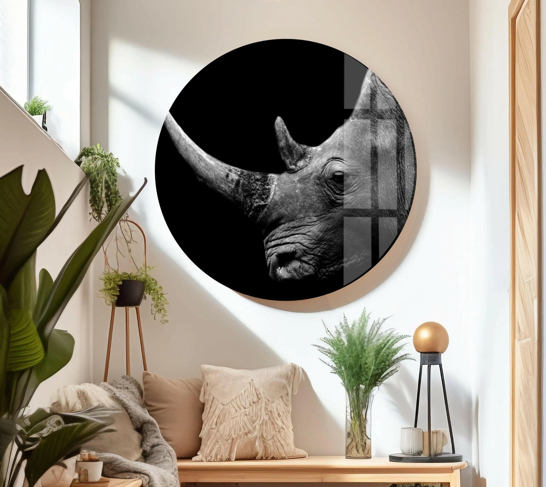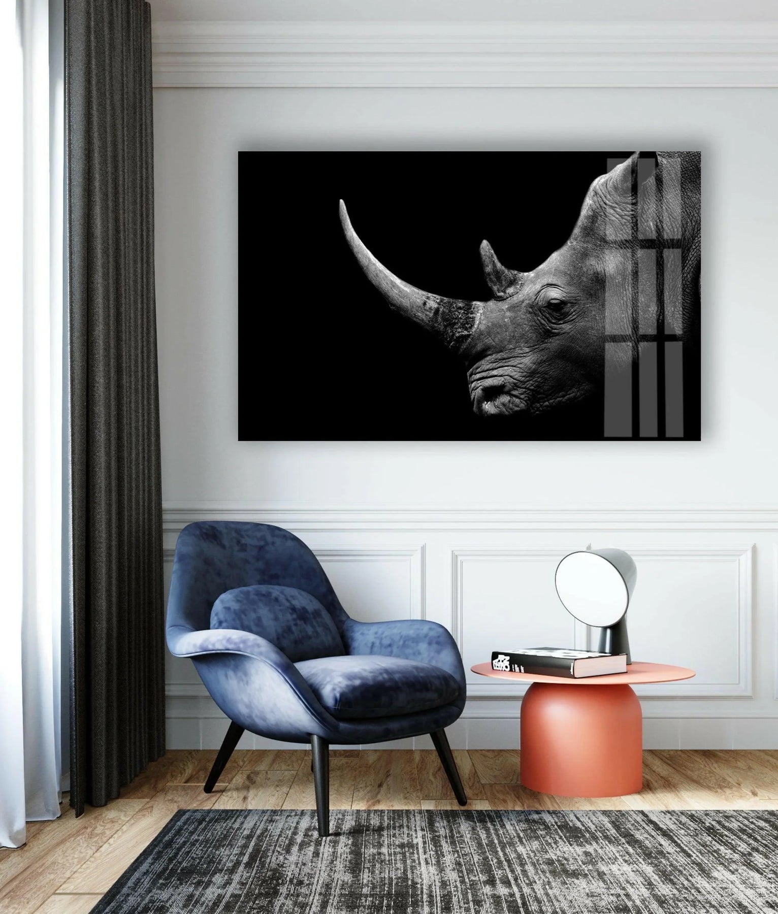 Black and white glass wall art featuring a close-up profile of a rhinoceros against a dark background.
