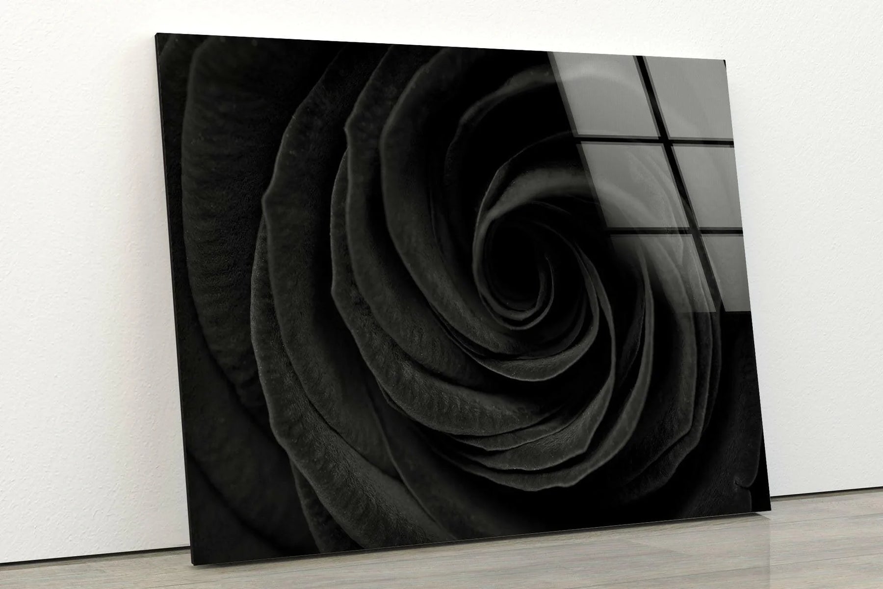 Textured black rose petals creating an elegant spiral composition on glass wall art.