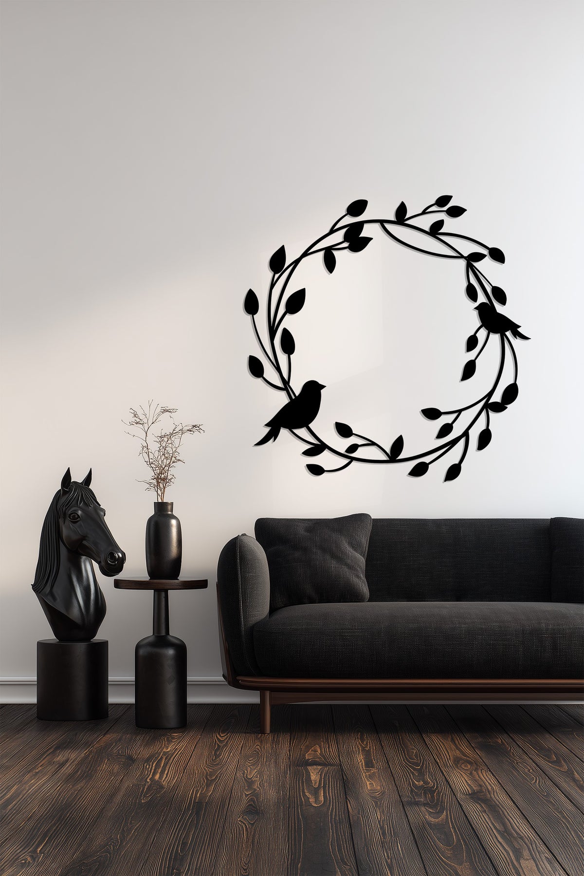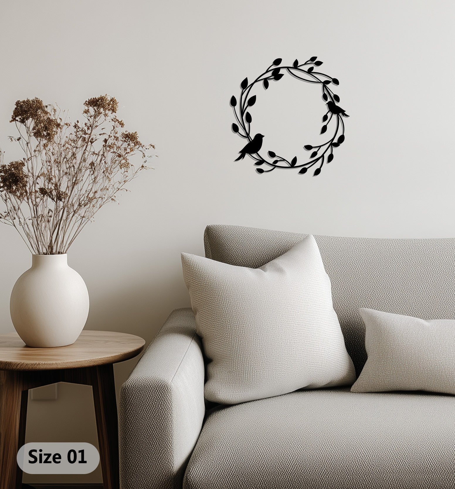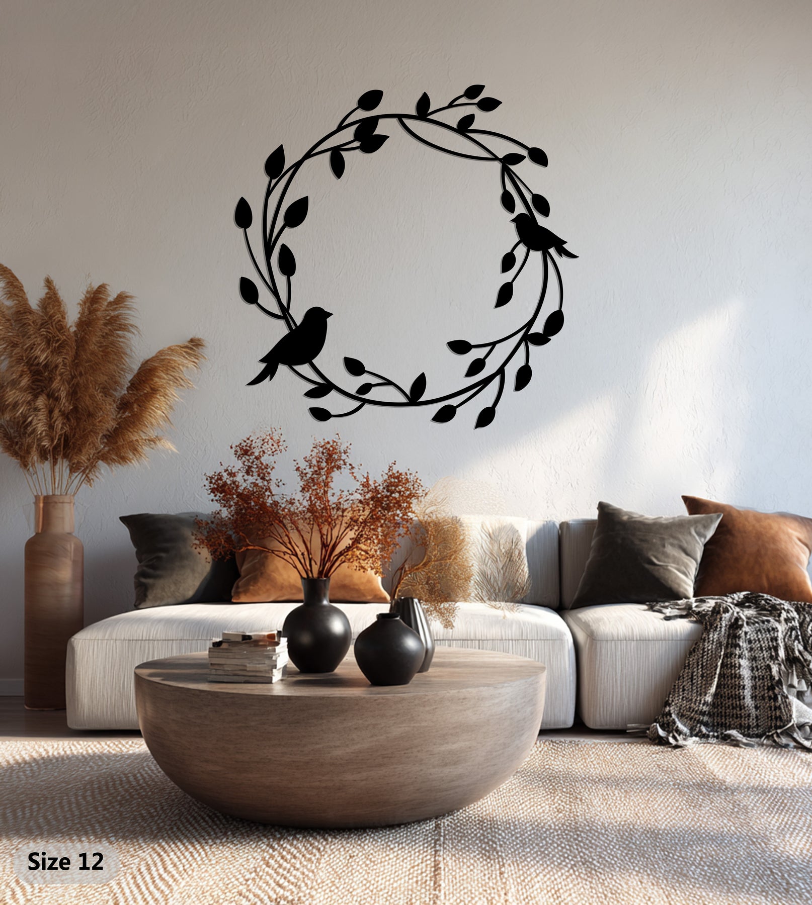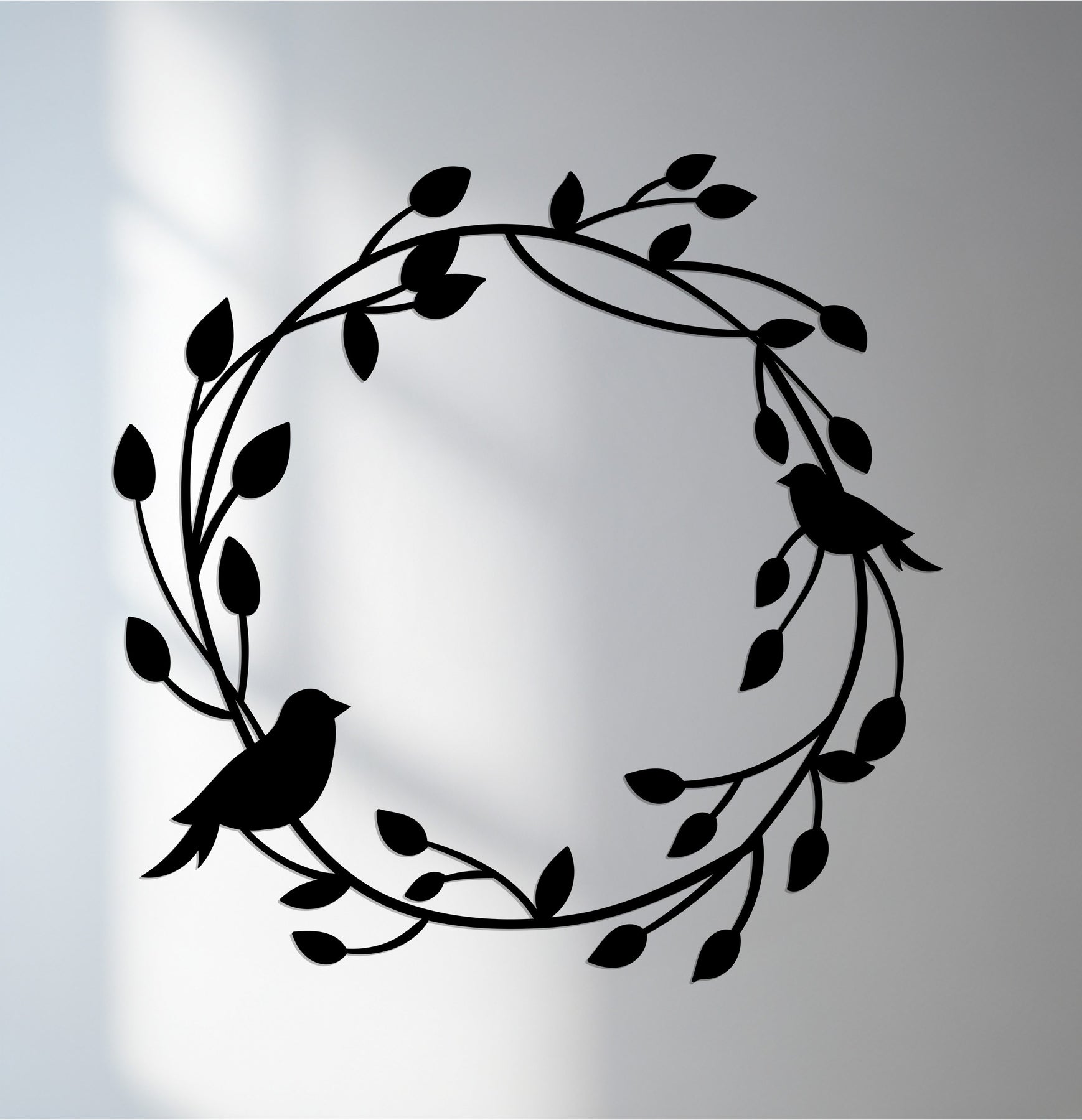 Celebra la bellezza della natura e lo stare insieme con Armonia in volo Decorazioni Murali in MetalloQuesto grazioso design raffigura due uccelli appollaiati su un tralcio circolare di foglie, simbolo di pace, connessione e rinnovamento. La sua silhouette fluida conferisce un delicato fascino organico, perfetto per interni luminosi e ariosi.