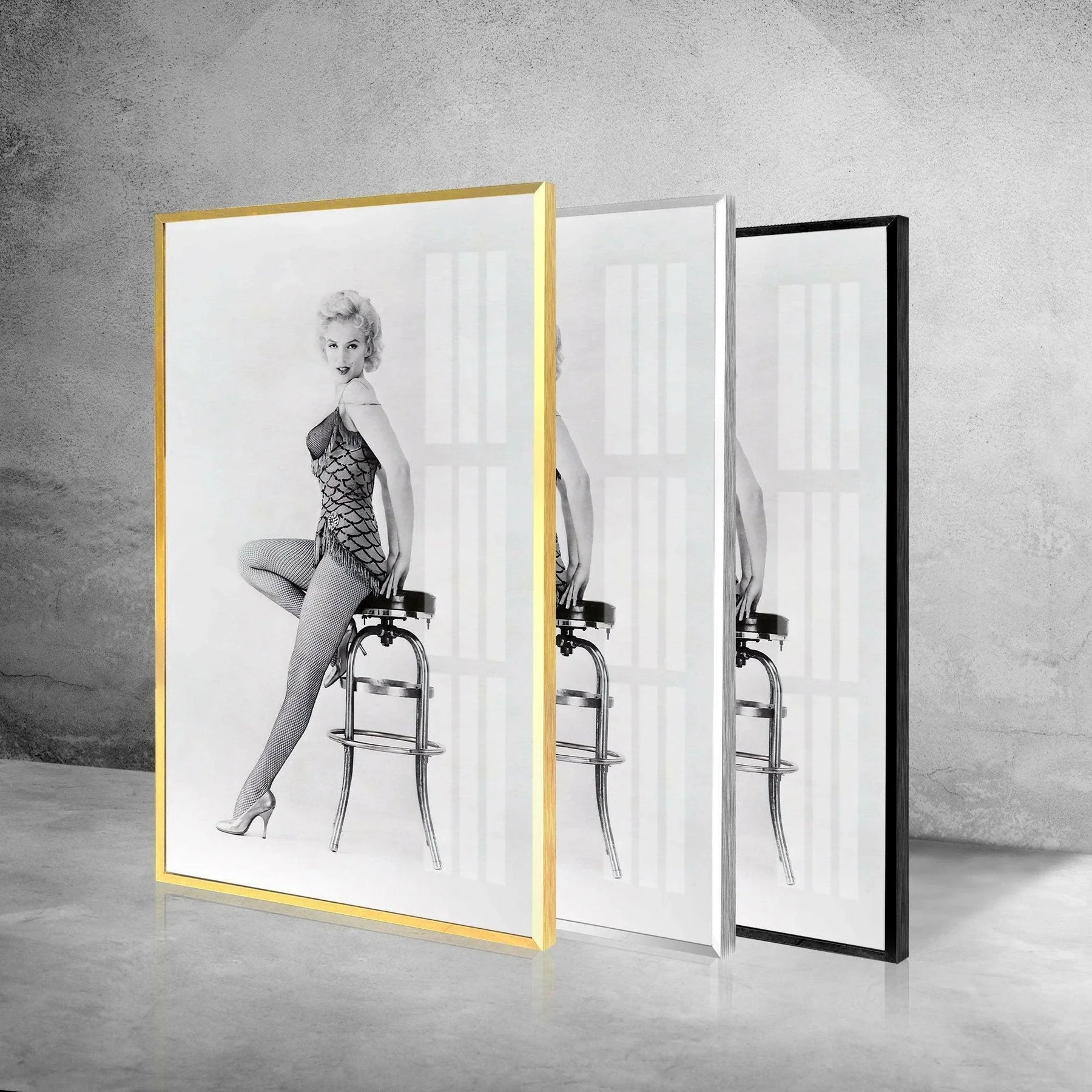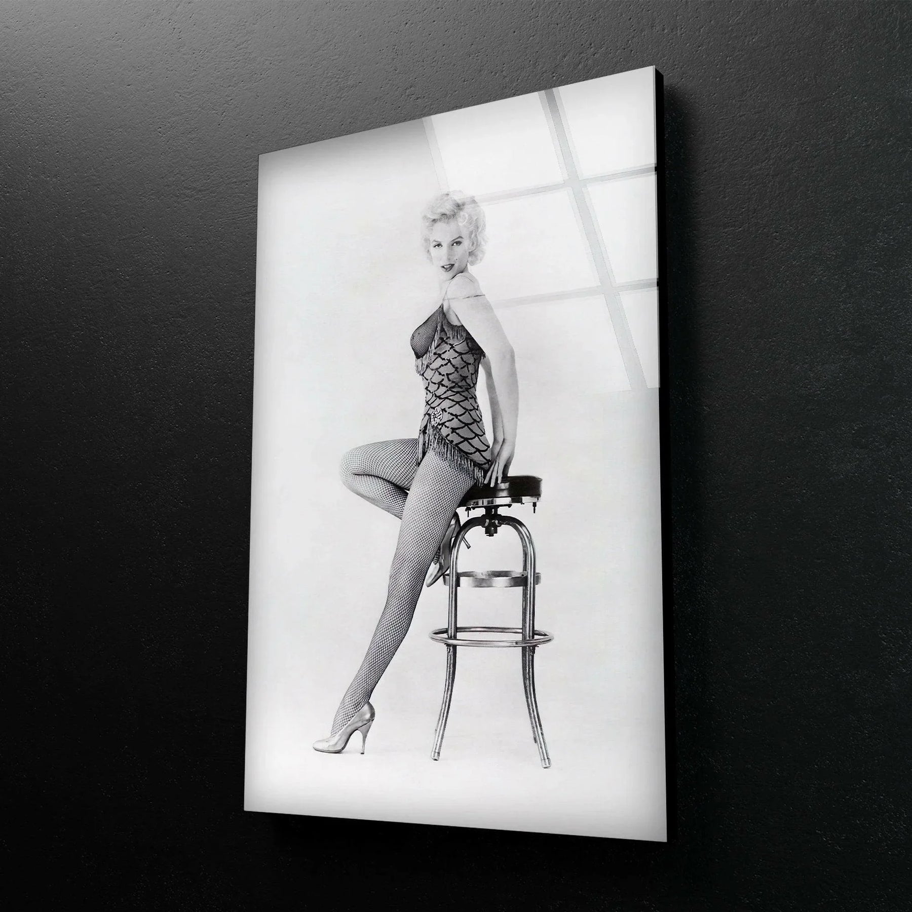 Elegant black and white glass wall art featuring Marilyn Monroe posing on a stool in vintage attire.